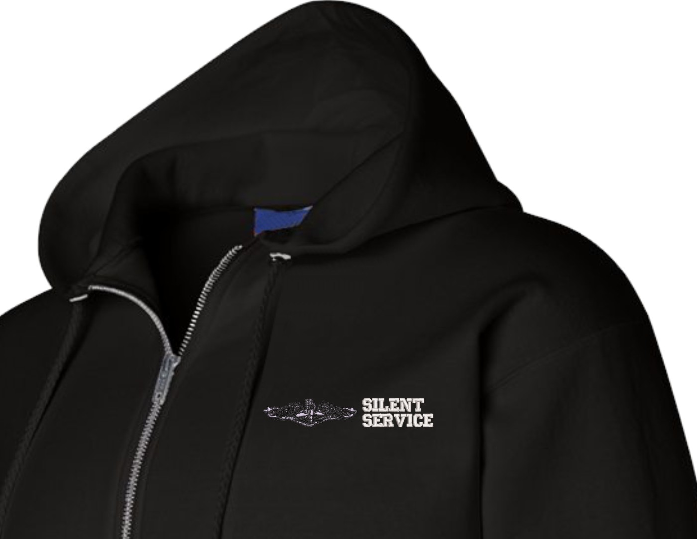MilitaryBest is proud to offer this quality U.S. Navy Enlisted Silver Dolphins Silent Service Zippered Hoodie. Each U.S. Navy Zippered Hoodie is direct embroidered onto either a Champion or Gildan brand Zippered Hoodie using a 9.5 oz 50/50 Cotton Poly blend material. These Military Zippered Hoodies are proudly embroidered at our facilities in Scottsboro, AL.