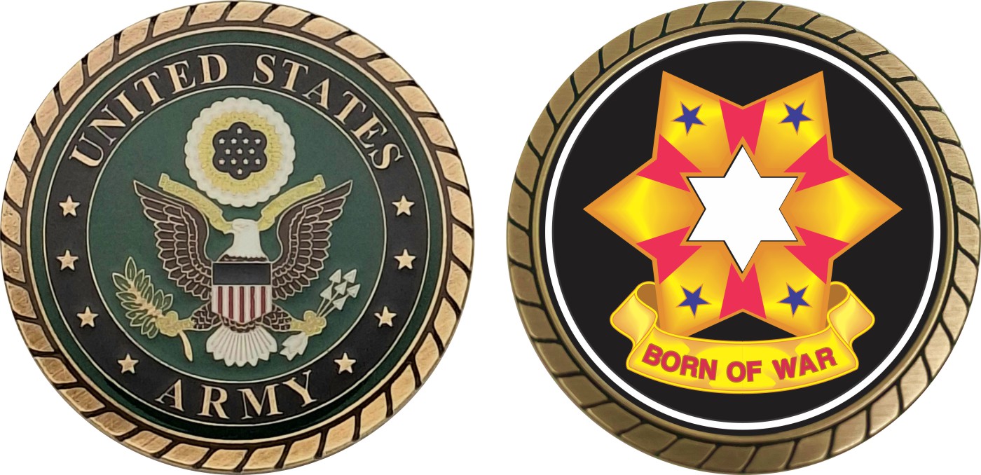 This 1 3/4” Sixth U.S. Army Unit Crest Challenge Coin is proudly offered by Militarybest. This Officially Licensed Army coin has beautiful enamel finish on one side and an organized crisp clean design on the opposite side.