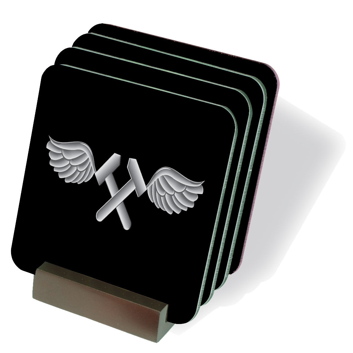 These Aviation structural mechanic drink coasters are proudly made in the USA and their quality is guaranteed! Each of our military drink coasters measure 3 ¾”, has a beautiful gloss finish and is manufactured with a soft cork underside to protect your furniture and prevent slipping. This set of coasters is accompanied by a handsome wood coaster holder display rack as shown in our picture above. We are proud to offer these U.S. Navy drink coasters and hope that you’ll enjoy them for years to come. Purchase for yourself or as a Military Gift for a friend or loved one.