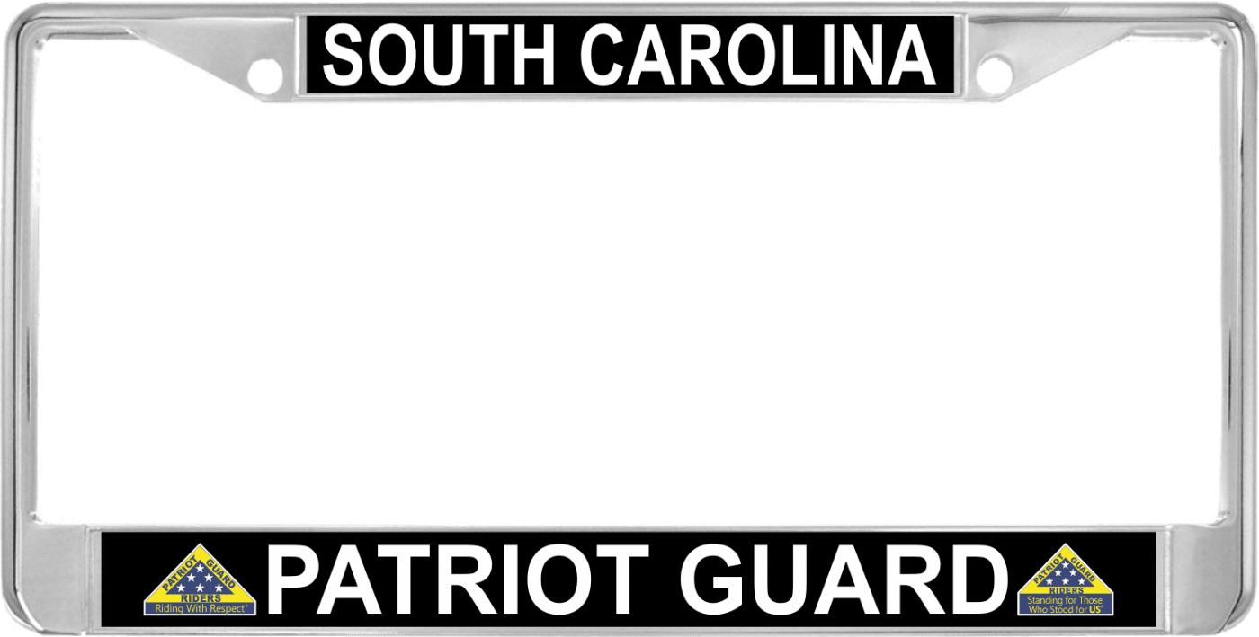 This South Carolina Patriot Guard Automobile License Plate Frame is proudly produced at our facility in Scottsboro, Alabama. Each Chrome Dipped Alloy Frame has Poly Coated Aluminum Inserts which allow our production team to provide you with High Quality Designs. Unfortunately, this frame is not offered as a Motorcycle Frame.Please check with your state and local regulations regarding suitability for displaying this Automobile License Plate Frame on your vehicle since these regulations may have changed in your state. Various weather and road conditions may impact the life span of your frame e.g. salted roads, long exposure to direct sunlight etc.