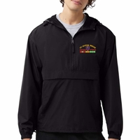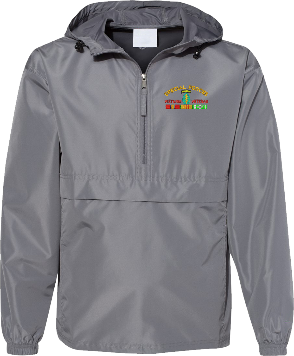 MilitaryBest is proud to offer this quality Special Forces Vietnam Veteran with Ribbons Hooded Windbreaker. Also known as an Anorak Jacket, this windbreaker is designed to keep wind and water out. With a design embroidered over the left chest, this windbreaker is embroidered to order at our facilities in Scottsboro, AL.. This windbreaker can be packed into the mesh lined pouch pocket for a more portable method of storage.- 100% Polyester