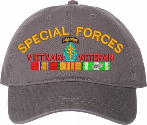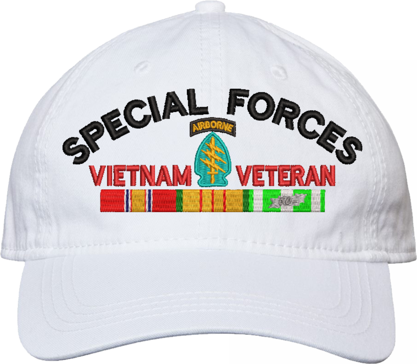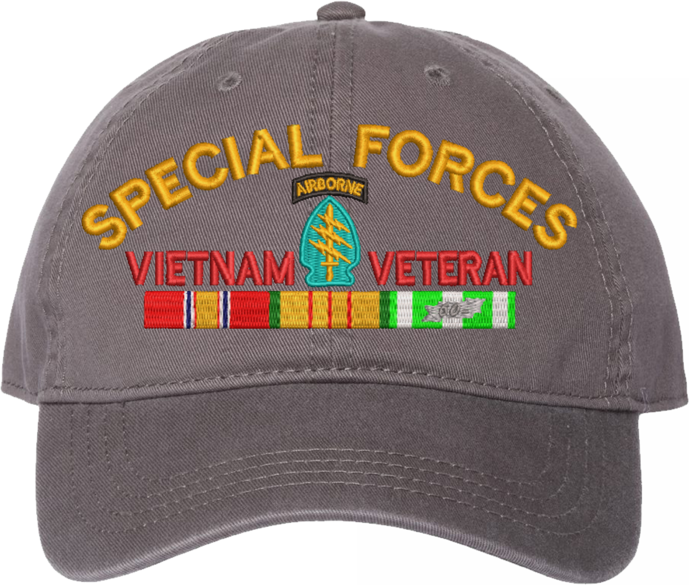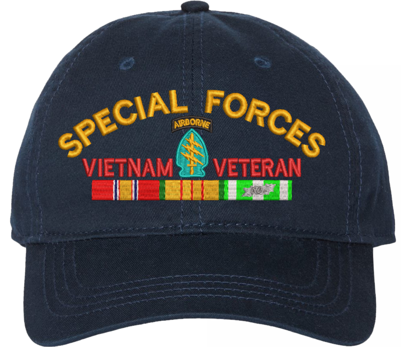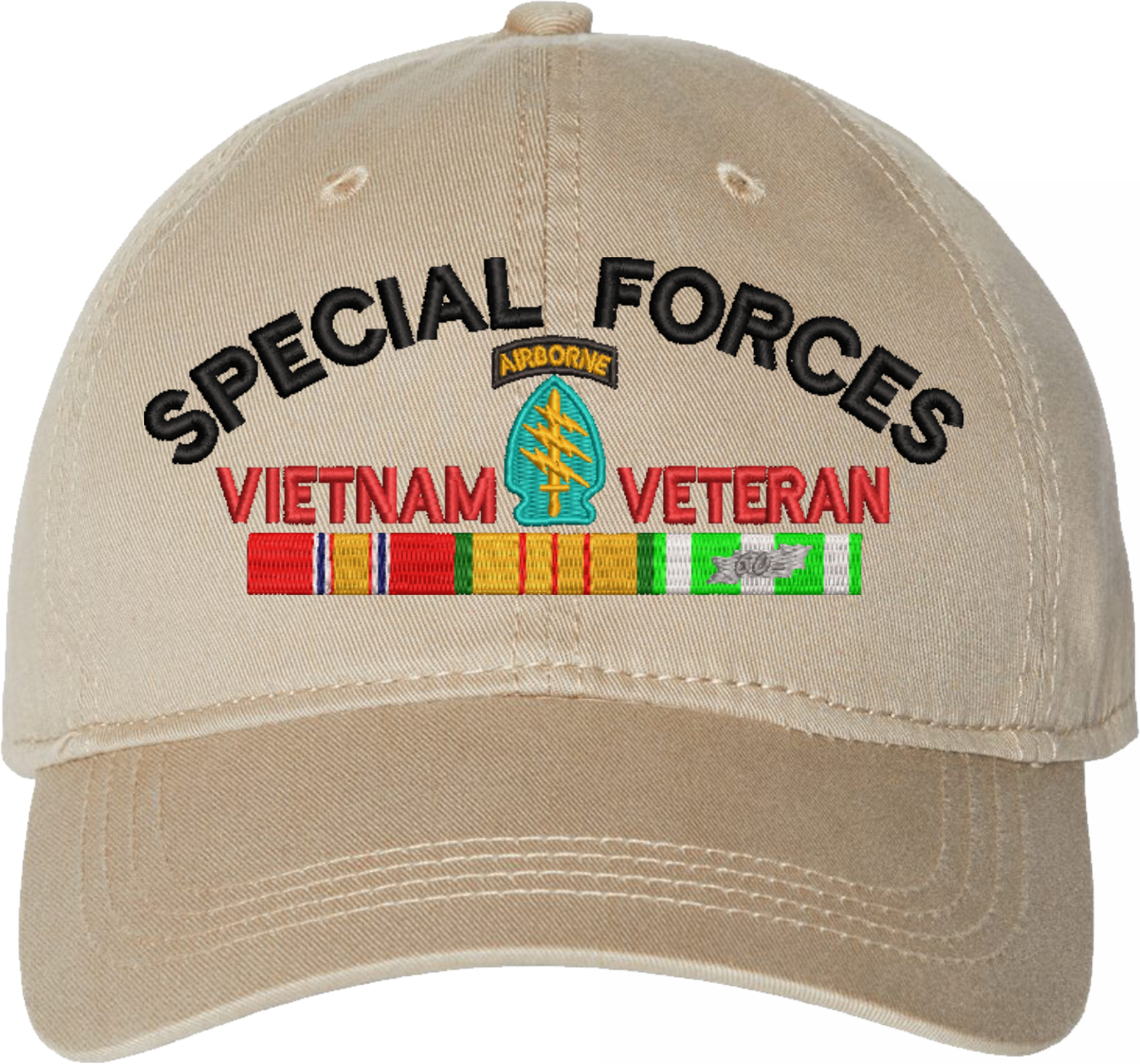 Show your Army pride with this Special Forces Vietnam Veteran with Ribbons Unstructured Dad Cap from MilitaryBest. Crafted from 100% washed chino twill cotton, this six-panel, low-profile cap offers a relaxed and comfortable fit. Featuring high-quality embroidery done in our Scottsboro, Alabama facility, this cap is designed with a pre-curved visor and an adjustable tri-glide buckle closure for a perfect fit. Whether for everyday wear or as a meaningful gift, this cap is a great way to honor your own or a loved one's service.For caps ordered with custom embroidered personalized text please allow an additional 3 to 5 days production time. All custom back text will be embroidered in ALL CAPITAL LETTERS. Caps with back text or eggs are non-returnable unless there is a material defect in the cap.