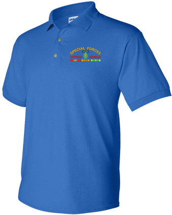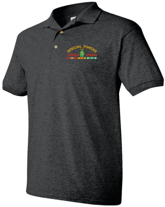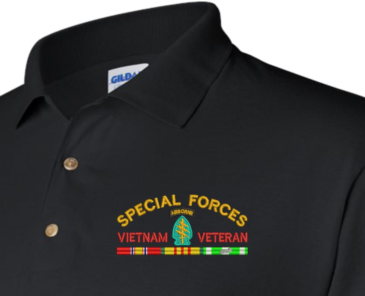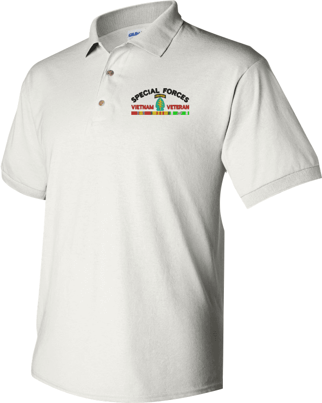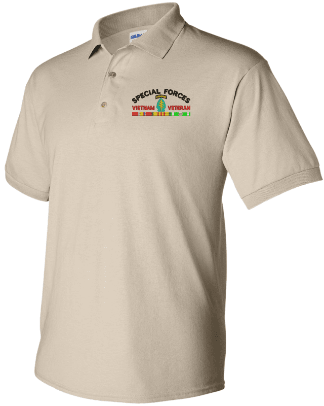 MilitaryBest is proud to offer this quality U.S. Army Special Forces Vietnam Veteran with Ribbons Embroidered Polo. Each Polo is available in either 100% Ringspun cotton pique or a 50/50 cotton/polyester blend. These quality Military Polos are proudly embroidered at our facilities in Scottsboro, AL. Support the Army MWR program by purchasing only from Licensed Vendors. To all of our Vietnam Veterans, Welcome Home!