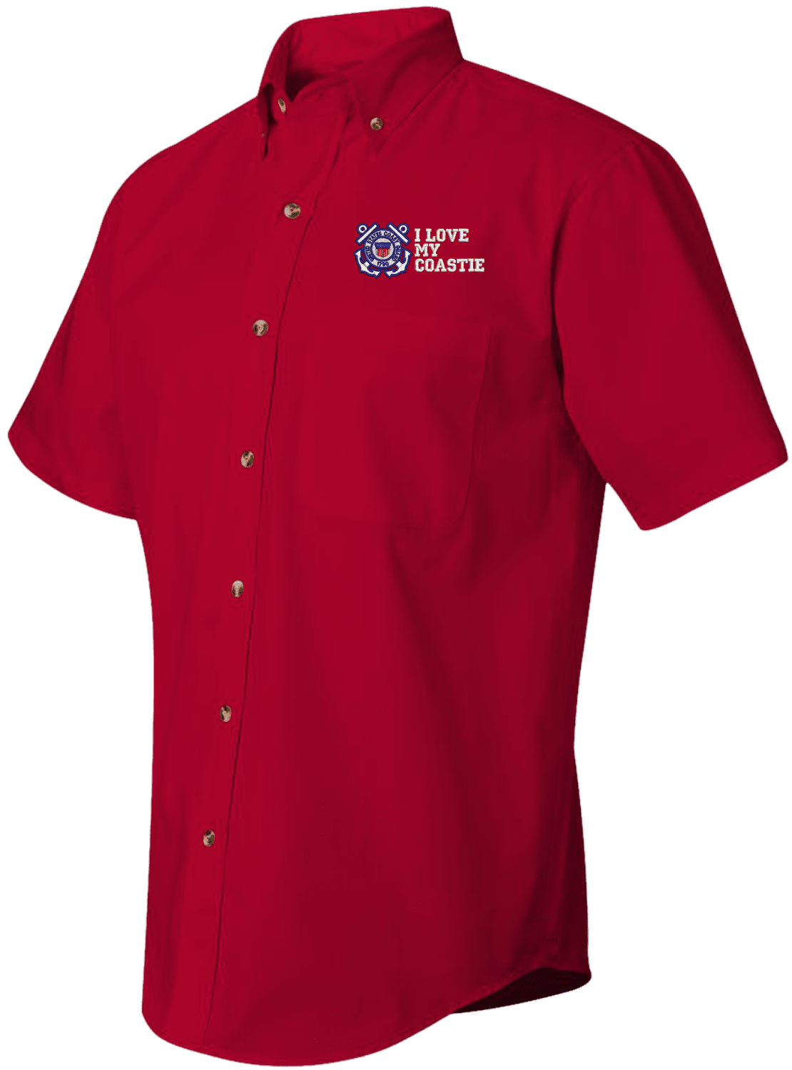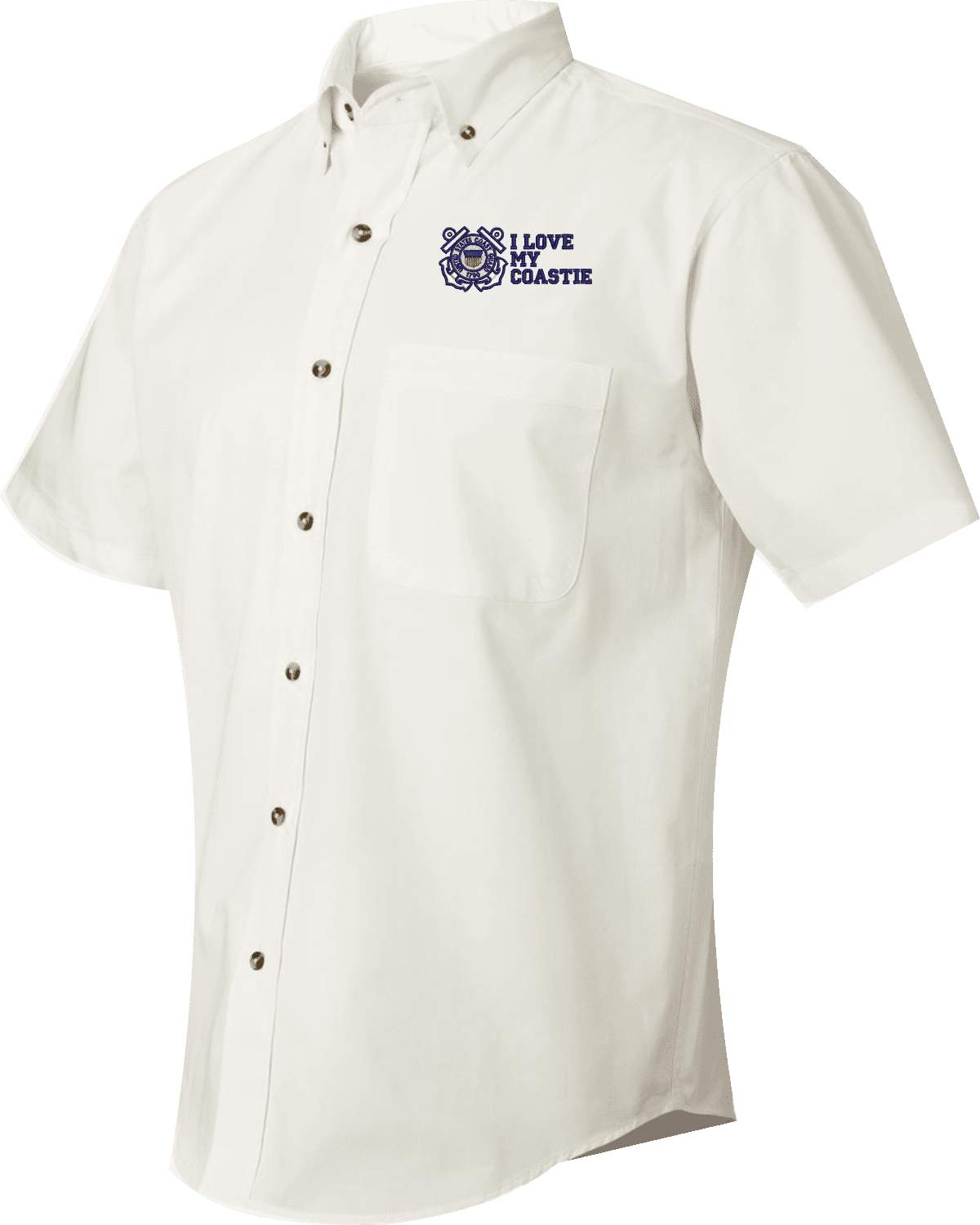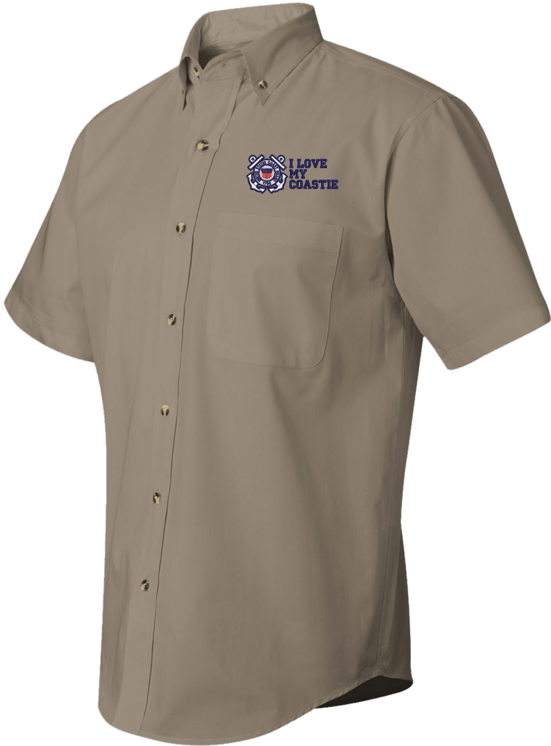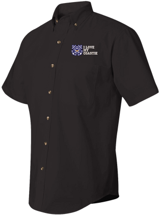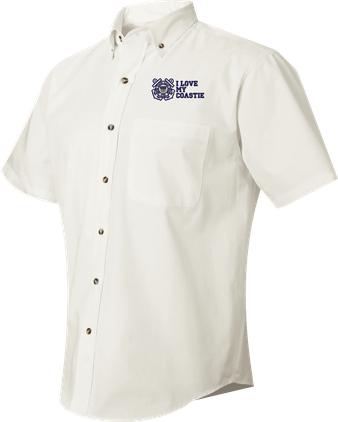 We are selling out of our remaining inventory of this discontinued item at a limited supply.MilitaryBest has expanded its line of apparel with this custom embroidered I Love My Coastie U.S. Coast Guard Short Sleeve Dress Shirt. This Featherlite brand short sleeve button down dress shirt is made using a stain-resistant 60/40 cotton/polyester twill material. This I Love My Coastie U.S. Coast Guard Short Sleeve Dress Shirt will make an excellent addition to your wardrobe or a quality gift. This I Love My Coastie U.S. Coast Guard Short Sleeve Dress Shirt is custom embroidered at our facilities in Scottsboro, Alabama.