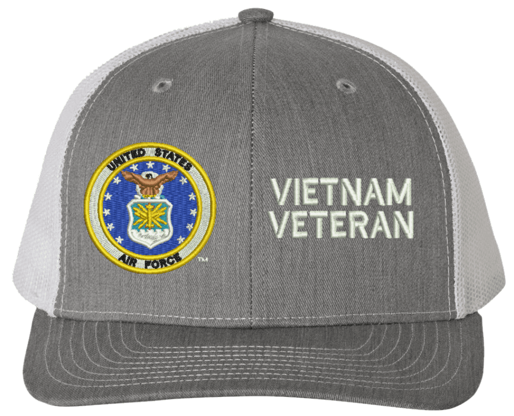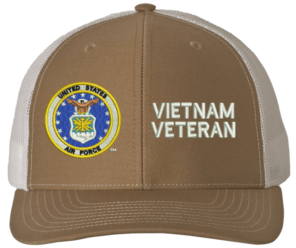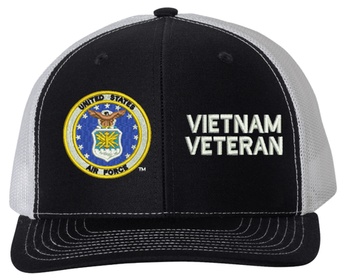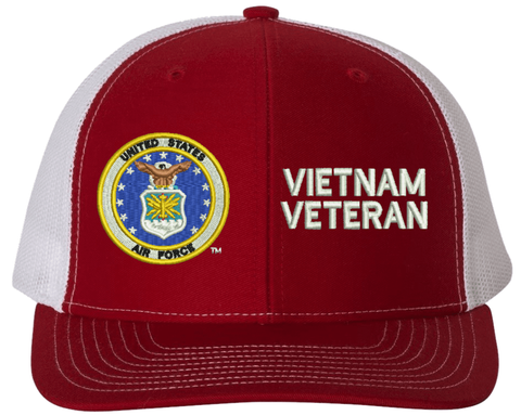 MilitaryBest is proud to offer this U.S. Air Force Symbol Vietnam Veteran Mesh Back Cap. The design of this U.S. Air Force Cap is crisp, clean, and sure to be loved by people of all ages! Select above from our many cap colors. This U.S. Air Force Symbol Vietnam Veteran Mesh Back Cap is crafted by our skilled embroidery technicians at our facilities in Scottsboro, AL. As with all MilitaryBest items, your satisfaction is guaranteed!Caps ordered with custom embroidered personalized back text require an additional 2 to 3 days production time. All custom back text will be embroidered in ALL CAPITAL LETTERS. Caps personalized with back text are non-returnable unless there is a material defect in the cap.