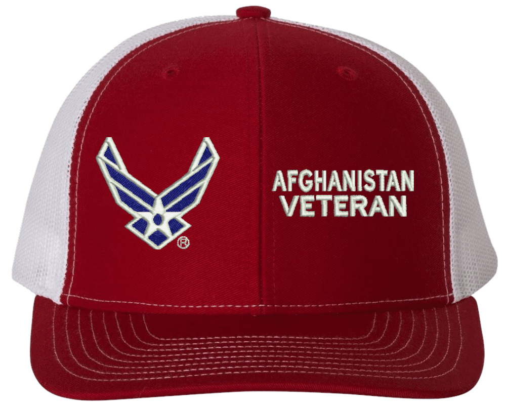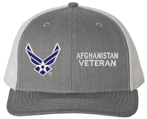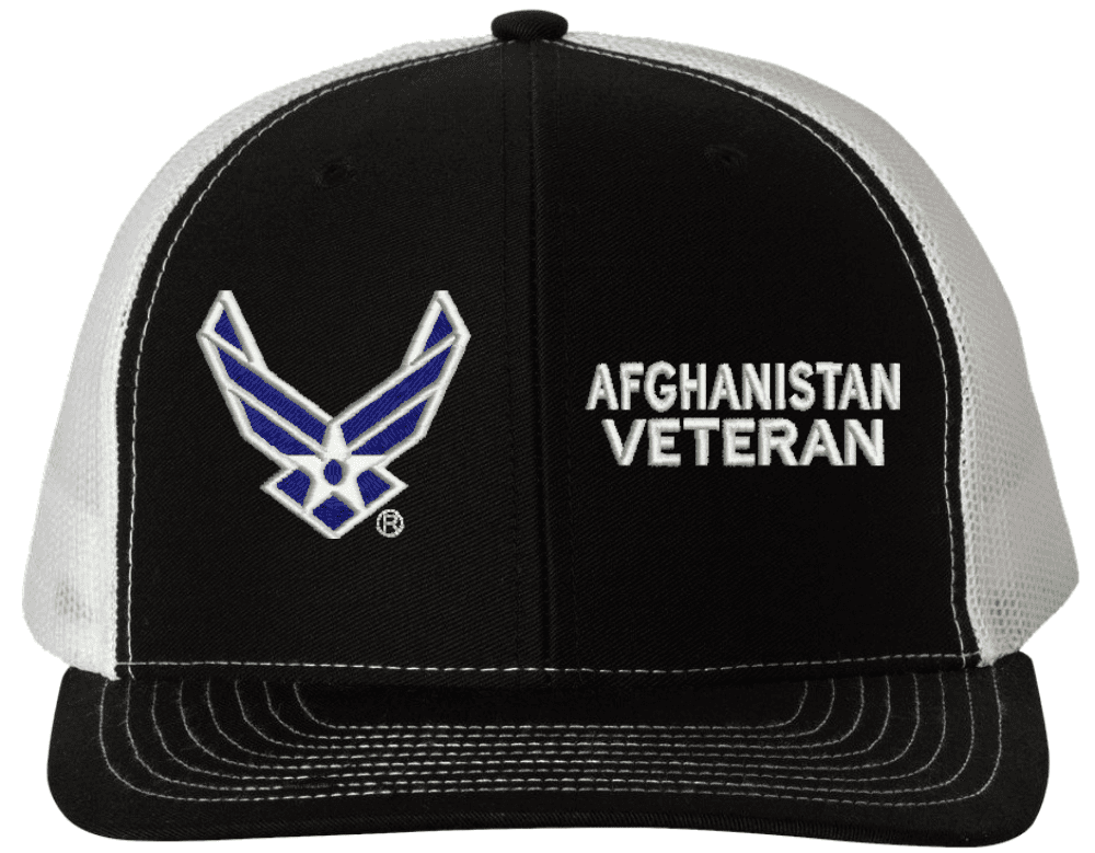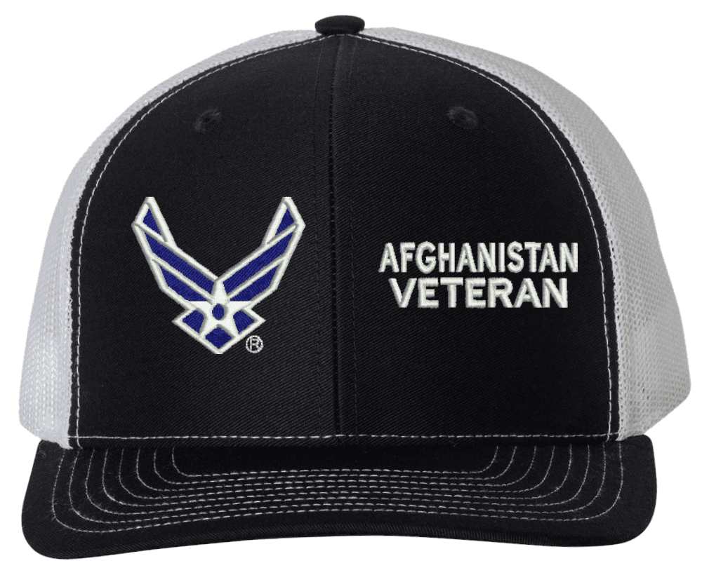 MilitaryBest is proud to offer this U.S. Air Force Hap Wings Afghanistan Veteran Mesh Back Cap. The design of this U.S. Air Force Cap is crisp, clean, and sure to be loved by people of all ages! Select above from our many cap colors. This U.S. Air Force Hap Wings Afghanistan Veteran Mesh Back Cap is crafted by our skilled embroidery technicians at our facilities in Scottsboro, AL. As with all MilitaryBest items, your satisfaction is guaranteed!Caps ordered with custom embroidered personalized back text require an additional 2 to 3 days production time. All custom back text will be embroidered in ALL CAPITAL LETTERS. Caps personalized with back text are non-returnable unless there is a material defect in the cap.