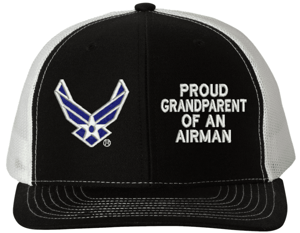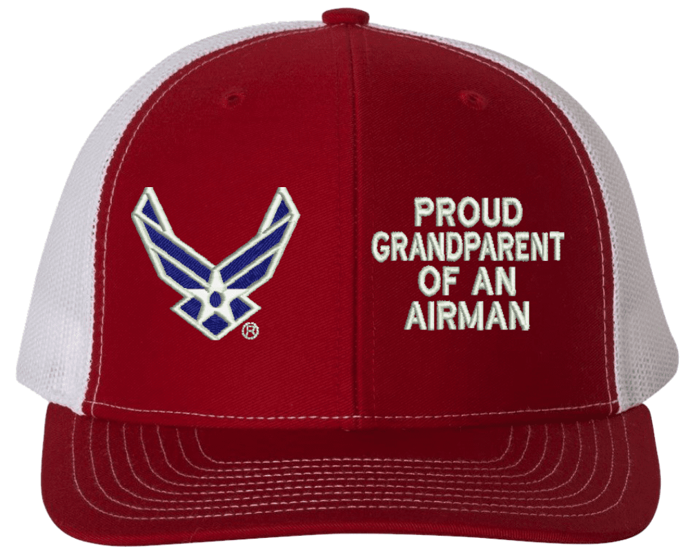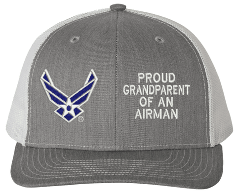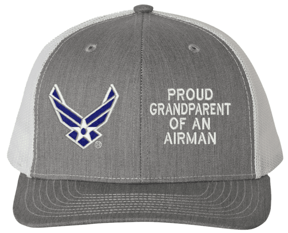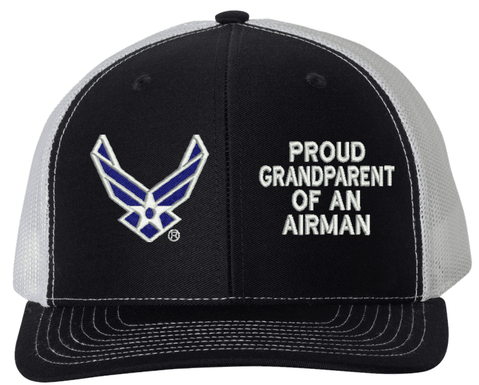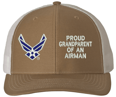 MilitaryBest is proud to offer this Proud Grandparent of an Airman U.S. Air Force Mesh Back Cap. The design of this U.S. Air Force Cap is crisp, clean, and sure to be loved by people of all ages! Select above from our many cap colors. This Proud Grandparent of an Airman U.S. Air Force Mesh Back Cap is crafted by our skilled embroidery technicians at our facilities in Scottsboro, AL. As with all MilitaryBest items, your satisfaction is guaranteed!Caps ordered with custom embroidered personalized back text require an additional 2 to 3 days production time. All custom back text will be embroidered in ALL CAPITAL LETTERS. Caps personalized with back text are non-returnable unless there is a material defect in the cap.