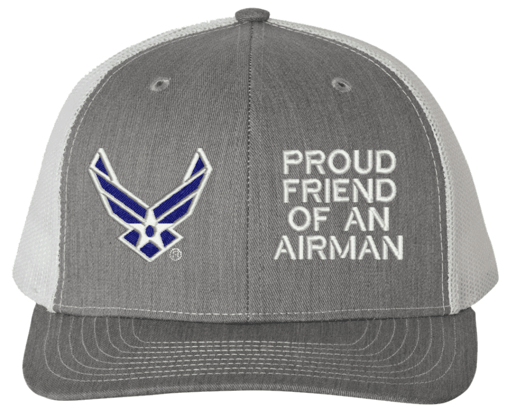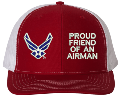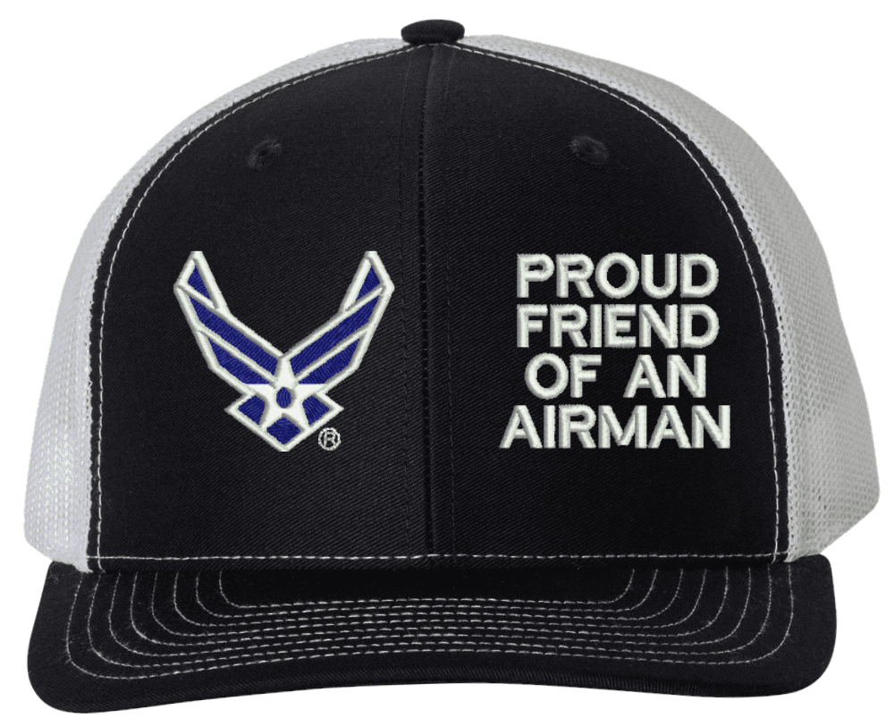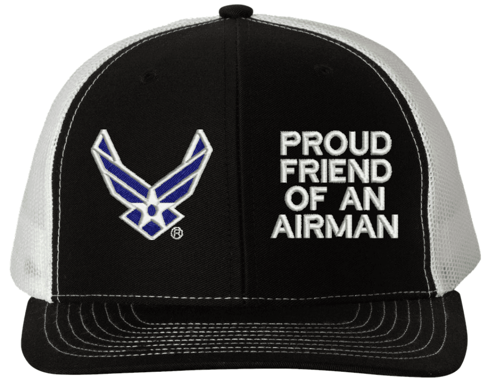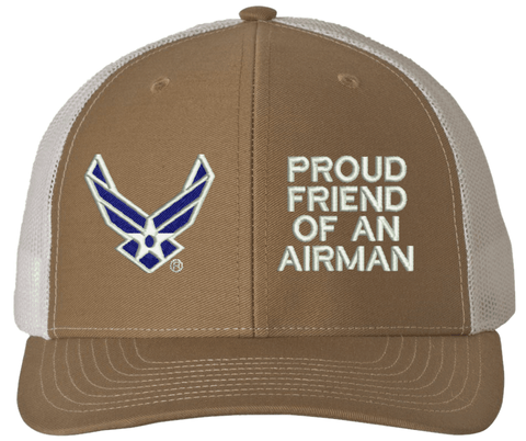 MilitaryBest is proud to offer this Proud Friend of an Airman U.S. Air Force Mesh Back Cap. The design of this U.S. Air Force Cap is crisp, clean, and sure to be loved by people of all ages! Select above from our many cap colors. This Proud Friend of an Airman U.S. Air Force Mesh Back Cap is crafted by our skilled embroidery technicians at our facilities in Scottsboro, AL. As with all MilitaryBest items, your satisfaction is guaranteed!Caps ordered with custom embroidered personalized back text require an additional 2 to 3 days production time. All custom back text will be embroidered in ALL CAPITAL LETTERS. Caps personalized with back text are non-returnable unless there is a material defect in the cap.