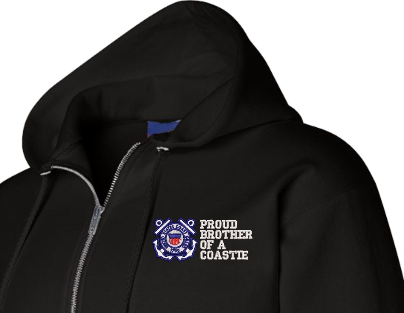 MilitaryBest has expanded its line of apparel with this custom embroidered Proud Brother of a Coastie U.S. Coast Guard Full Zip Hoodie. Each Hoodie is direct embroidered onto a Champion brand 9.5 oz 50/50 Cotton Poly blend. This Proud Brother of a Coastie U.S. Coast Guard Full Zip Hoodie will make an excellent addition to your wardrobe, or a great gift. Your satisfaction is Guaranteed! This Proud Brother of a Coastie U.S. Coast Guard Full Zip Hoodie is custom embroidered at our facilities in Scottsboro, AL.