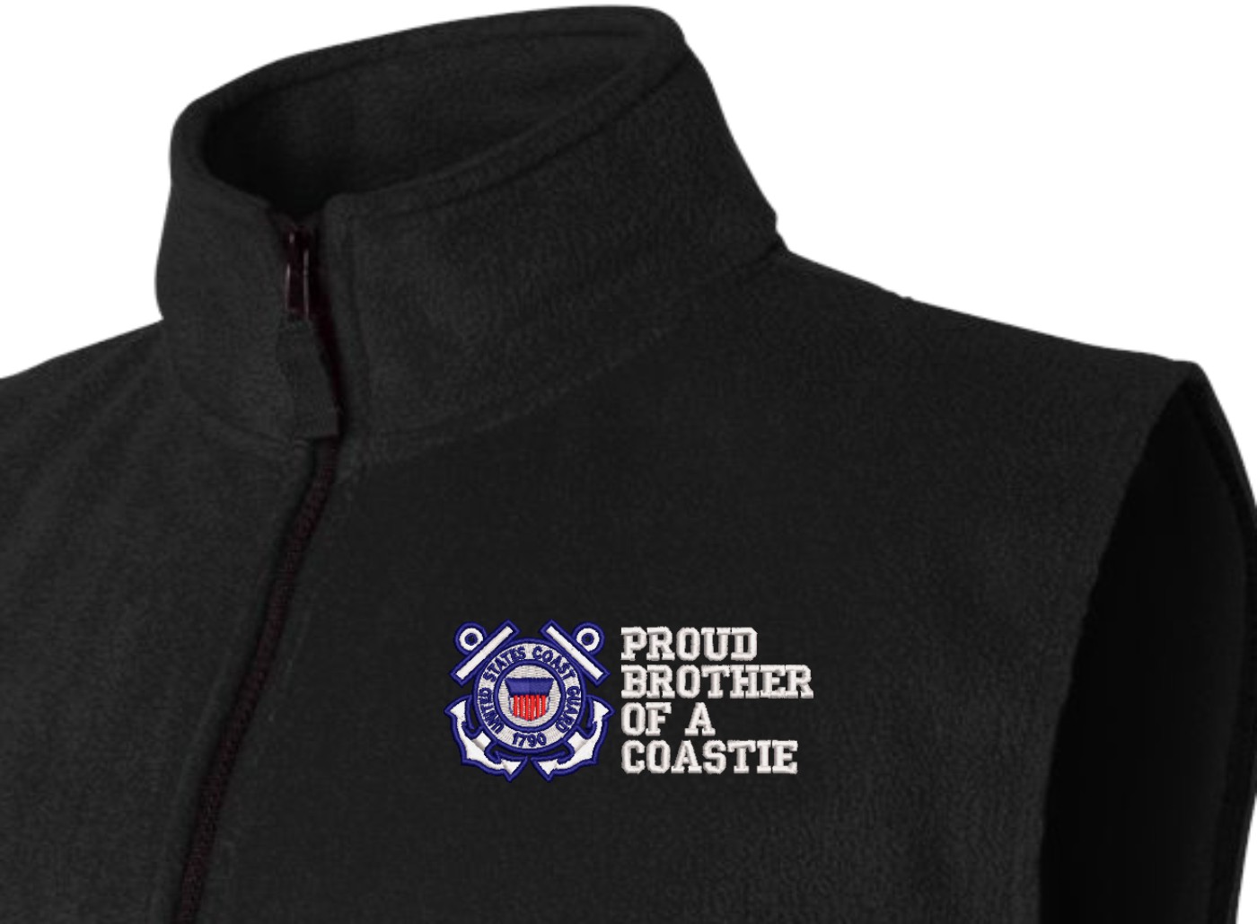 Due to supply chain disruptions, some colors and sizes may not be available in the same Brand, in these cases a brand of comparable quality will be used. Feel free to call in advance of your order, with questions you may have.MilitaryBest is proud to offer this quality Proud Brother of a Coastie U.S. Coast Guard Full Zip Fleece Vest. This Proud Brother of a Coastie U.S. Coast Guard Full Zip Fleece Vest features a convertible collar with dyed-to-match zipper pull, oversized nylon reinforced slash pockets, and an elastic hem. It is made using a 100% anti-pill polyester Fleece Vest. This Proud Brother of a Coastie U.S. Coast Guard Full Zip Fleece Vest will make an excellent addition to your wardrobe, or a quality gift. Your satisfaction is guaranteed! These Vests are custom embroidered at our facilities in Scottsboro, AL.