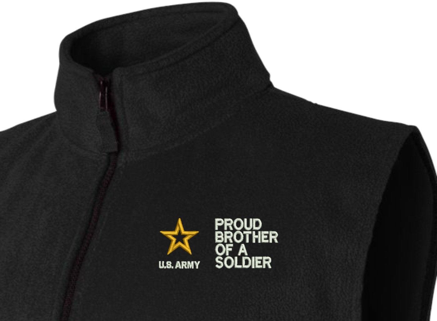 Due to supply chain disruptions, some colors and sizes may not be available in the same Brand, in these cases a brand of comparable quality will be used. Feel free to call in advance of your order, with questions you may have.MilitaryBest is proud to offer this quality Proud Brother of a Soldier U.S. Army Full Zip Fleece Vest. This Proud Brother of a Soldier U.S. Army Full Zip Fleece Vest features a convertible collar with dyed-to-match zipper pull, oversized nylon reinforced slash pockets, and an elastic hem. It is made using a 100% anti-pill polyester Fleece Vest. This Proud Brother of a Soldier U.S. Army Full Zip Fleece Vest will make an excellent addition to your wardrobe, or a quality gift. Your satisfaction is guaranteed! These Vests are custom embroidered at our facilities in Scottsboro, AL.