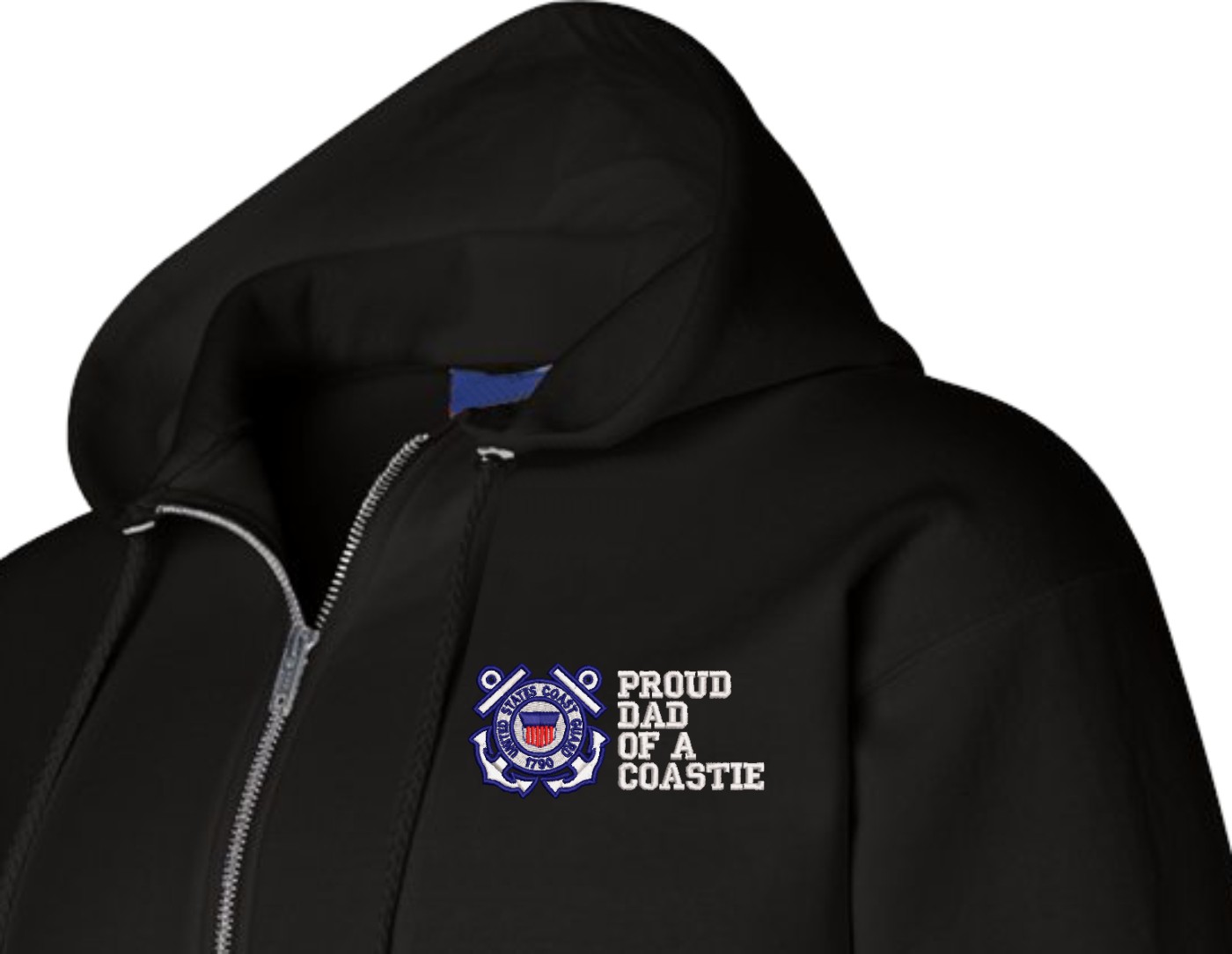 MilitaryBest has expanded its line of apparel with this custom embroidered Proud Dad of a Coastie U.S. Coast Guard Full Zip Hoodie. Each Hoodie is direct embroidered onto a Champion brand 9.5 oz 50/50 Cotton Poly blend. This Proud Dad of a Coastie U.S. Coast Guard Full Zip Hoodie will make an excellent addition to your wardrobe, or a great gift. Your satisfaction is Guaranteed! This Proud Dad of a Coastie U.S. Coast Guard Full Zip Hoodie is custom embroidered at our facilities in Scottsboro, AL.