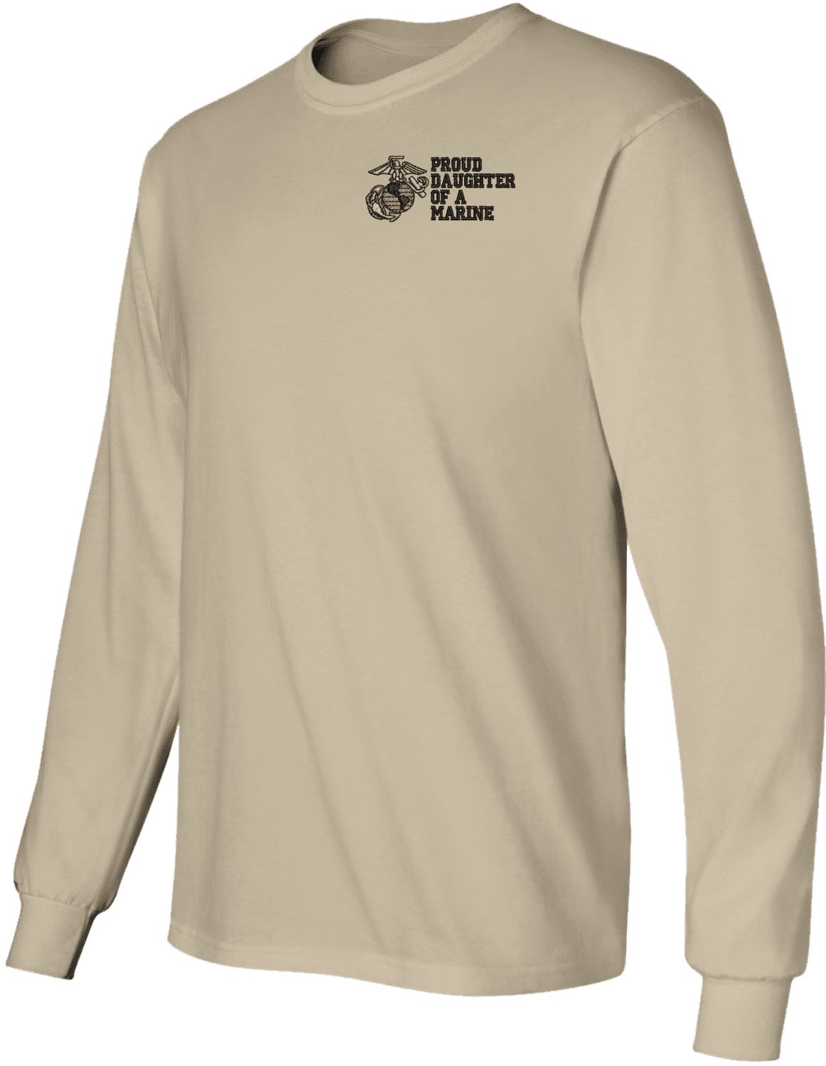Note: Some of the Color Options pictured may not be available. Available Color Options are listed on the drop down menu above.MilitaryBest has expanded its line of apparel with this custom embroidered Proud Daughter of a Marine U.S. Marine Corps Embroidered Long Sleeve T-Shirt. This Gildan brand long sleeve t-shirt is made using a 6 oz pre-shrunk 100% cotton material. This Proud Daughter of a Marine U.S. Marine Corps Embroidered Long Sleeve T-Shirt will make an excellent addition to your wardrobe or a quality gift. This Proud Daughter of a Marine U.S. Marine Corps Embroidered Long Sleeve T-Shirt is custom embroidered at our facilities in Scottsboro, Alabama.