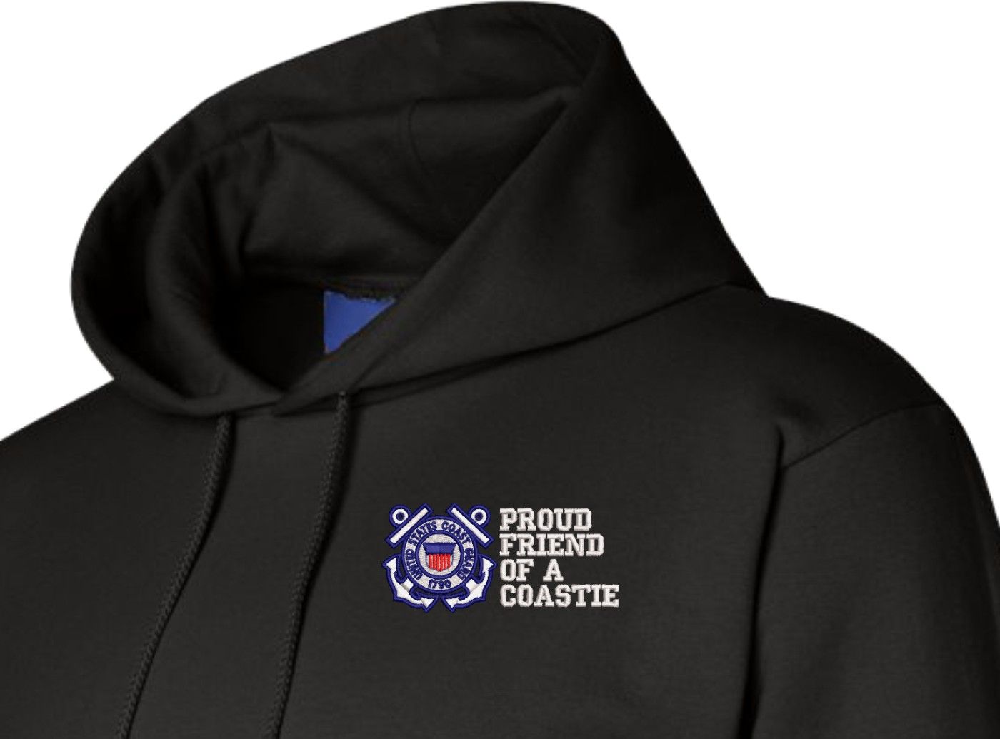 MilitaryBest has expanded its line of apparel with this custom embroidered Proud Friend of a Coastie U.S. Coast Guard Hoodie. Each Hoodie is direct embroidered onto a Champion brand 9.5 oz 50/50 Cotton Poly blend. This Proud Friend of a Coastie U.S. Coast Guard Hoodie will make an excellent addition to your wardrobe, or a great gift. Your satisfaction is Guaranteed! This Proud Friend of a Coastie U.S. Coast Guard Hoodie is custom embroidered at our facilities in Scottsboro, AL.