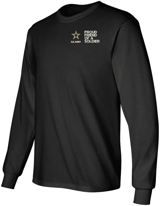 Note: Some of the Color Options pictured may not be available. Available Color Options are listed on the drop down menu above.MilitaryBest has expanded its line of apparel with this custom embroidered Proud Friend of a Soldier U.S. Army Embroidered Long Sleeve T-Shirt. This Gildan brand long sleeve t-shirt is made using a 6 oz pre-shrunk 100% cotton material. This Proud Friend of a Soldier U.S. Army Embroidered Long Sleeve T-Shirt will make an excellent addition to your wardrobe or a quality gift. This Proud Friend of a Soldier U.S. Army Embroidered Long Sleeve T-Shirt is custom embroidered at our facilities in Scottsboro, Alabama.