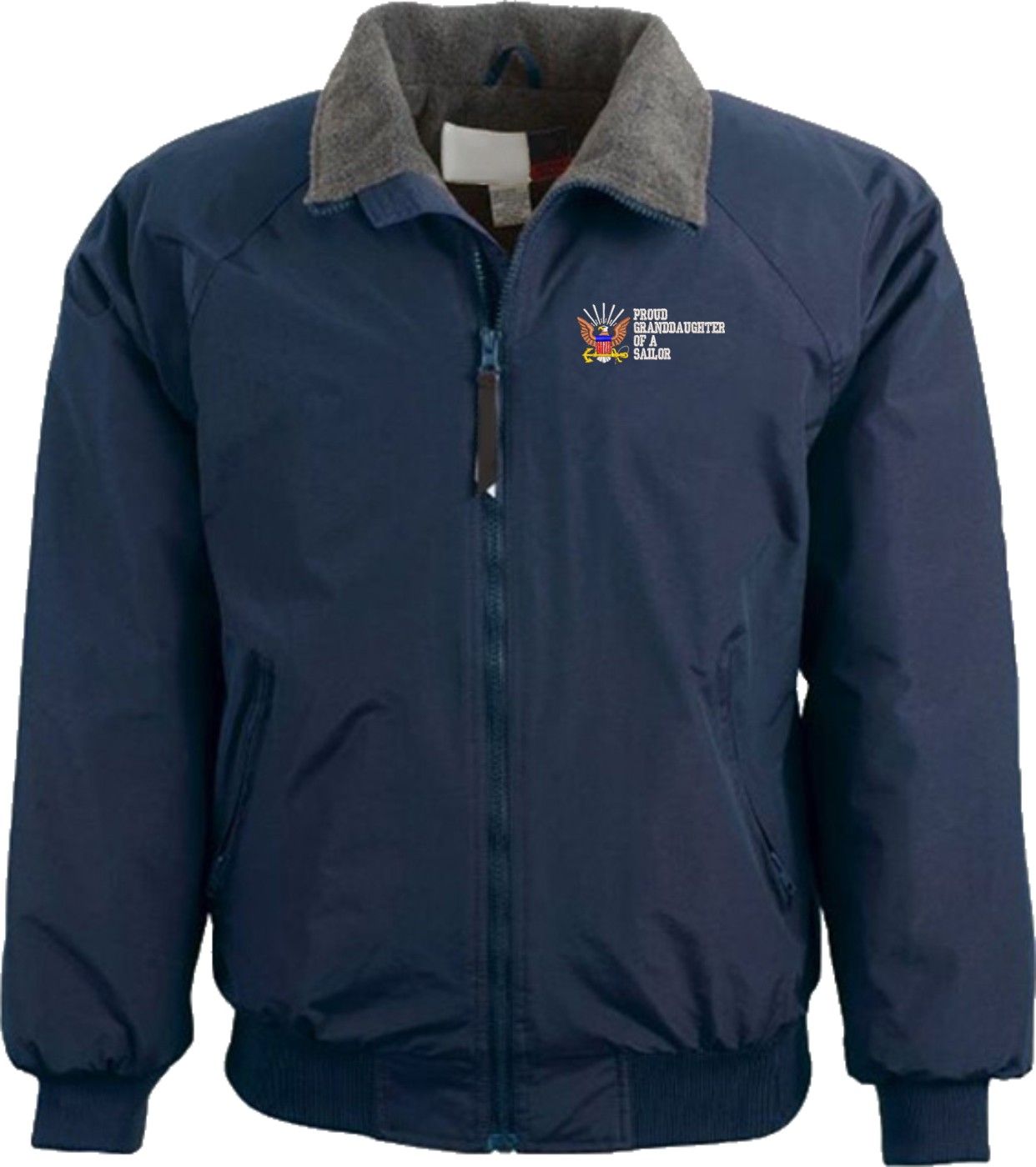 Note: Some of the Color Options pictured may not be available. Available Color Options are listed on the drop down menu above.MilitaryBest is proud to offer this quality Proud Grandaughter of a Sailor U.S. Navy 3 Season Jacket. This Proud Grandaughter of a Sailor U.S. Navy 3 Season Jacket is made from a 3-Layer system consisting of a nylon shell, an insulator layer, Nylon-lined sleeves, and an inside layer of fleece for comfort. The jacket features include a sturdy black enamel front-zipper, raglan sleeves, outsize zip pockets, an inside zip security pocket, YKK zippers, and a banded-bottom. This Proud Grandaughter of a Sailor U.S. Navy 3 Season Jacket will make an excellent addition to your wardrobe, or a quality gift. Your satisfaction is guaranteed! Depending on your location this jacket can be worn in fall, winter, and spring. This jacket is custom embroidered at our facilities in Scottsboro, AL.