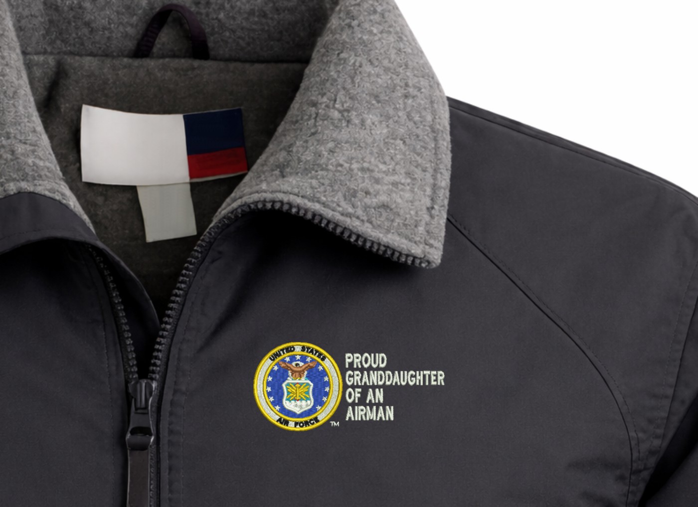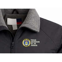 Note: Some of the Color Options pictured may not be available. Available Color Options are listed on the drop down menu above.MilitaryBest is proud to offer this quality Proud Grandaughter of an Airman U.S. Air Force 3 Season Jacket. This Proud Grandaughter of an Airman U.S. Air Force 3 Season Jacket is made from a 3-Layer system consisting of a nylon shell, an insulator layer, Nylon-lined sleeves, and an inside layer of fleece for comfort. The jacket features include a sturdy black enamel front-zipper, raglan sleeves, outsize zip pockets, an inside zip security pocket, YKK zippers, and a banded-bottom. This Proud Grandaughter of an Airman U.S. Air Force 3 Season Jacket will make an excellent addition to your wardrobe, or a quality gift. Your satisfaction is guaranteed! Depending on your location this jacket can be worn in fall, winter, and spring. This jacket is custom embroidered at our facilities in Scottsboro, AL.