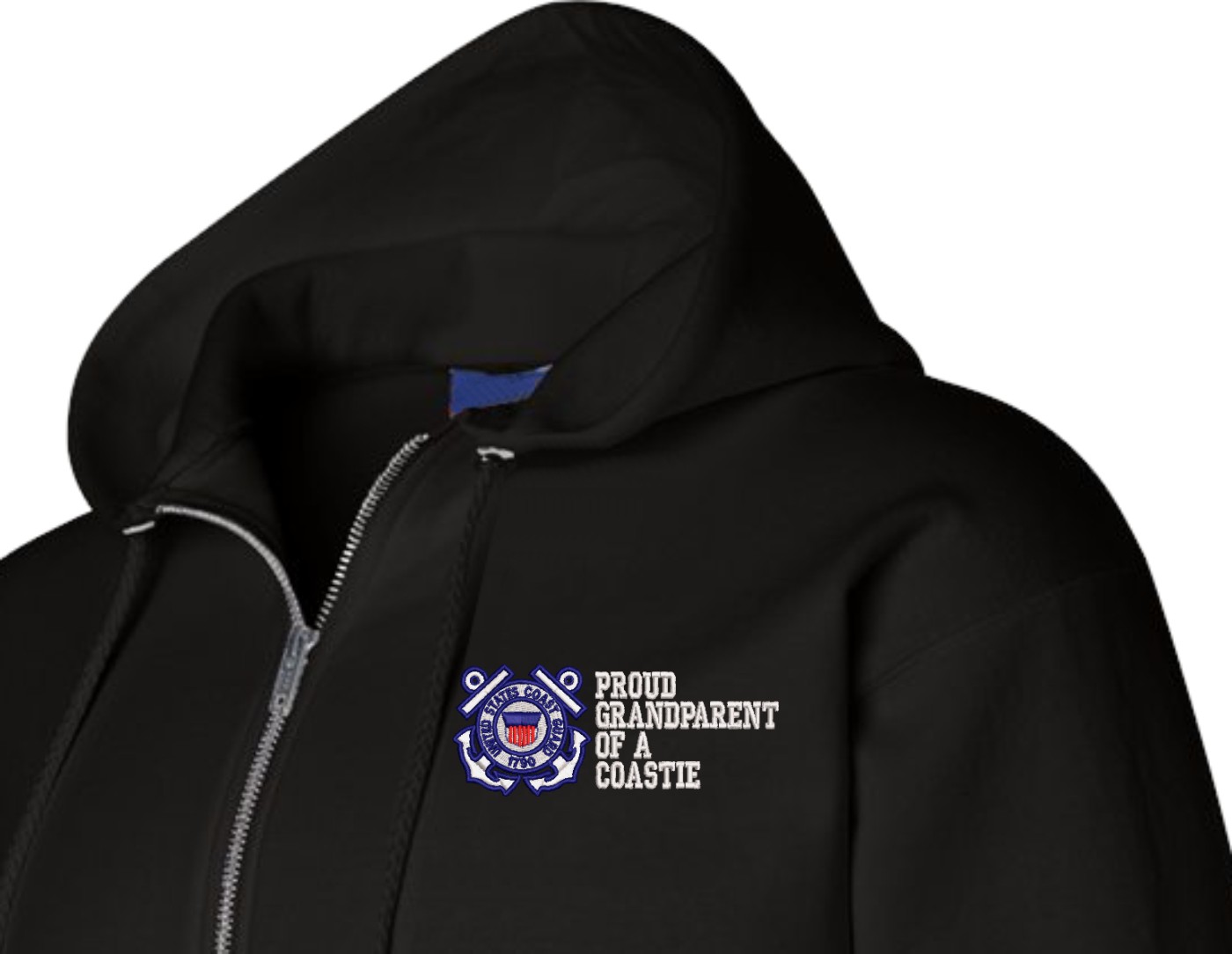 MilitaryBest has expanded its line of apparel with this custom embroidered Proud GrandParent of a Coastie U.S. Coast Guard Full Zip Hoodie. Each Hoodie is direct embroidered onto a Champion brand 9.5 oz 50/50 Cotton Poly blend. This Proud GrandParent of a Coastie U.S. Coast Guard Full Zip Hoodie will make an excellent addition to your wardrobe, or a great gift. Your satisfaction is Guaranteed! This Proud GrandParent of a Coastie U.S. Coast Guard Full Zip Hoodie is custom embroidered at our facilities in Scottsboro, AL.