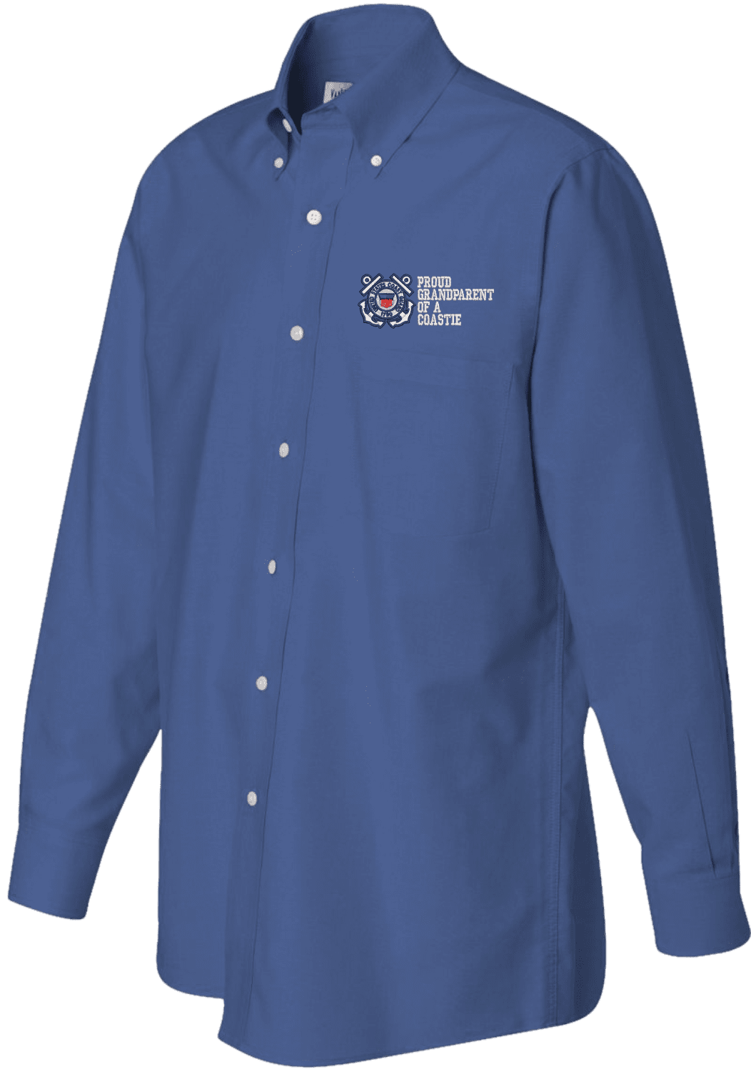 Note: Some of the Color Options pictured may not be available. Available Color Options are listed on the drop down menu above.MilitaryBest has expanded its line of apparel with this custom embroidered Proud GrandParent of a Coastie U.S. Coast Guard Oxford Shirt. This Van Heusen brand Oxford long sleeve button down dress shirt is made using a wrinkle-free, pill and stain resistant 60/40 cotton/polyester material. This Proud GrandParent of a Coastie U.S. Coast Guard Oxford Shirt will make an excellent addition to your wardrobe or a quality gift. This Proud GrandParent of a Coastie U.S. Coast Guard Oxford Shirt is custom embroidered at our facilities in Scottsboro, Alabama.
