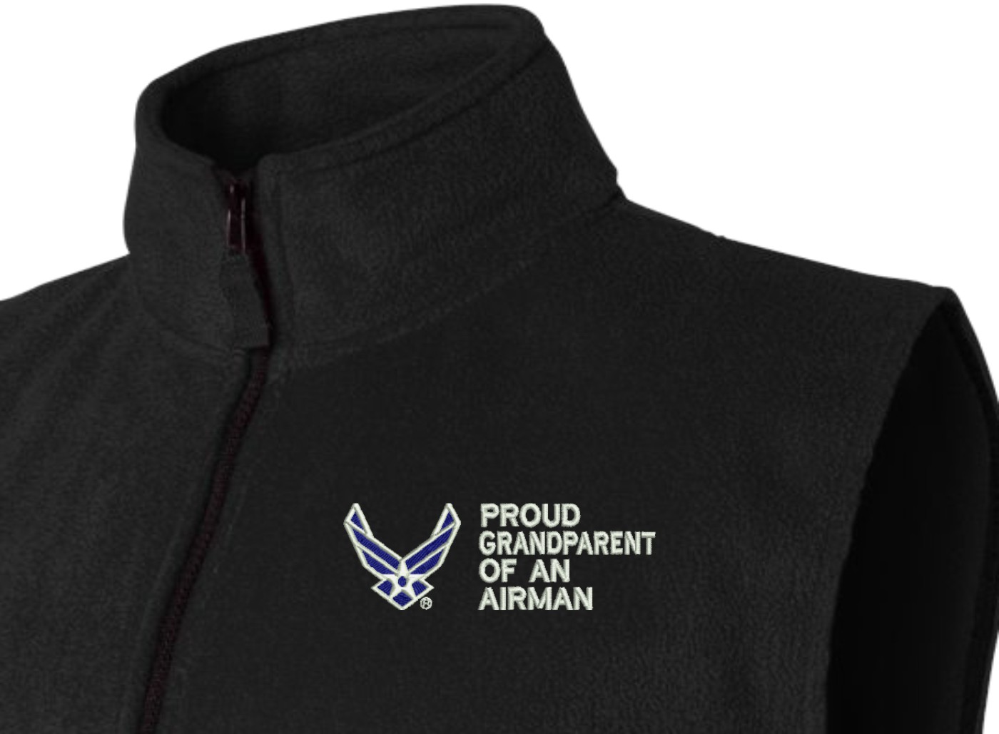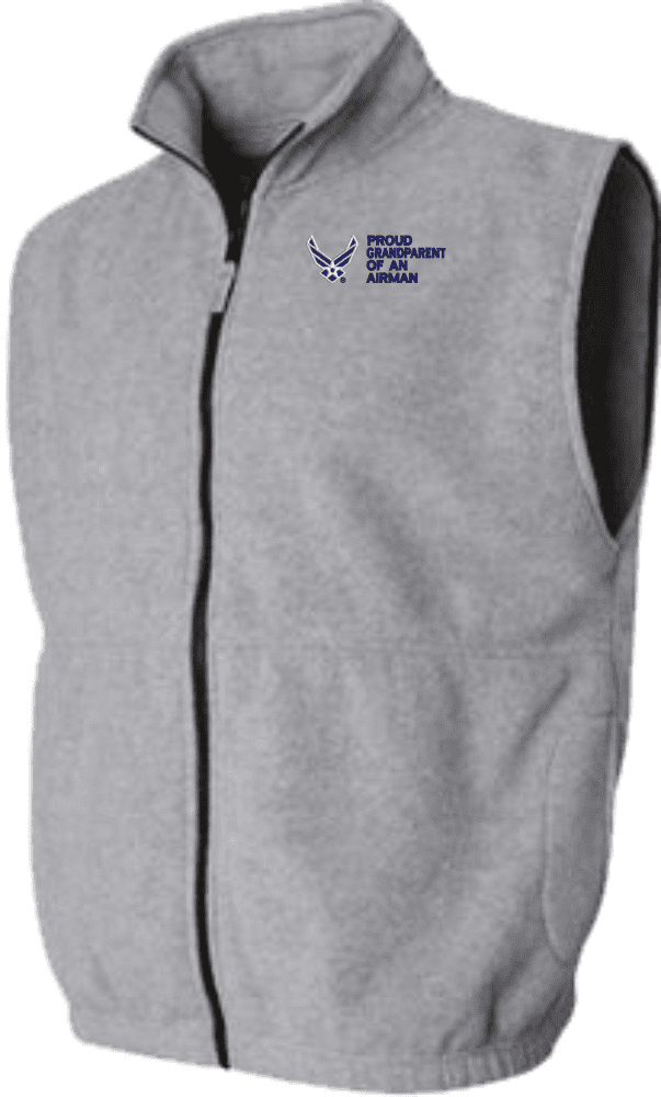 Due to supply chain disruptions, some colors and sizes may not be available in the same Brand, in these cases a brand of comparable quality will be used. Feel free to call in advance of your order, with questions you may have.MilitaryBest is proud to offer this quality Proud Grandparent of an Airman U.S. Air Force Full Zip Fleece Vest. This Proud Grandparent of an Airman U.S. Air Force Full Zip Fleece Vest features a convertible collar with dyed-to-match zipper pull, oversized nylon reinforced slash pockets, and an elastic hem. It is made using a 100% anti-pill polyester Fleece Vest. This Proud Grandparent of an Airman U.S. Air Force Full Zip Fleece Vest will make an excellent addition to your wardrobe, or a quality gift. Your satisfaction is guaranteed! These Vests are custom embroidered at our facilities in Scottsboro, AL.