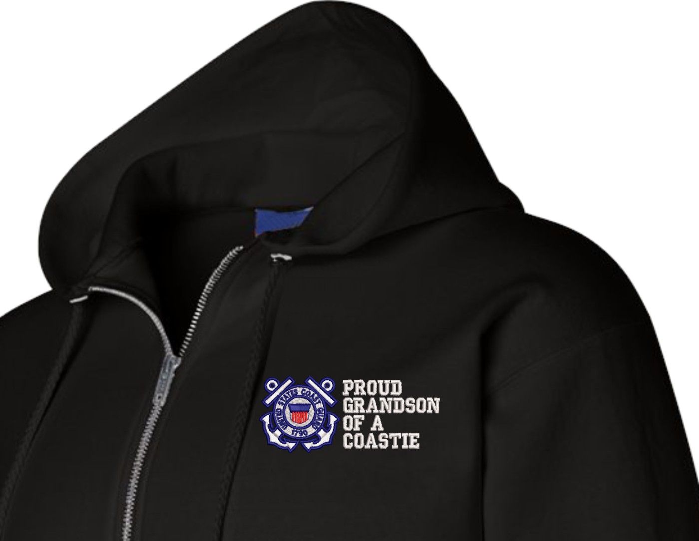 MilitaryBest has expanded its line of apparel with this custom embroidered Proud Grandson of a Coastie U.S. Coast Guard Full Zip Hoodie. Each Hoodie is direct embroidered onto a Champion brand 9.5 oz 50/50 Cotton Poly blend. This Proud Grandson of a Coastie U.S. Coast Guard Full Zip Hoodie will make an excellent addition to your wardrobe, or a great gift. Your satisfaction is Guaranteed! This Proud Grandson of a Coastie U.S. Coast Guard Full Zip Hoodie is custom embroidered at our facilities in Scottsboro, AL.