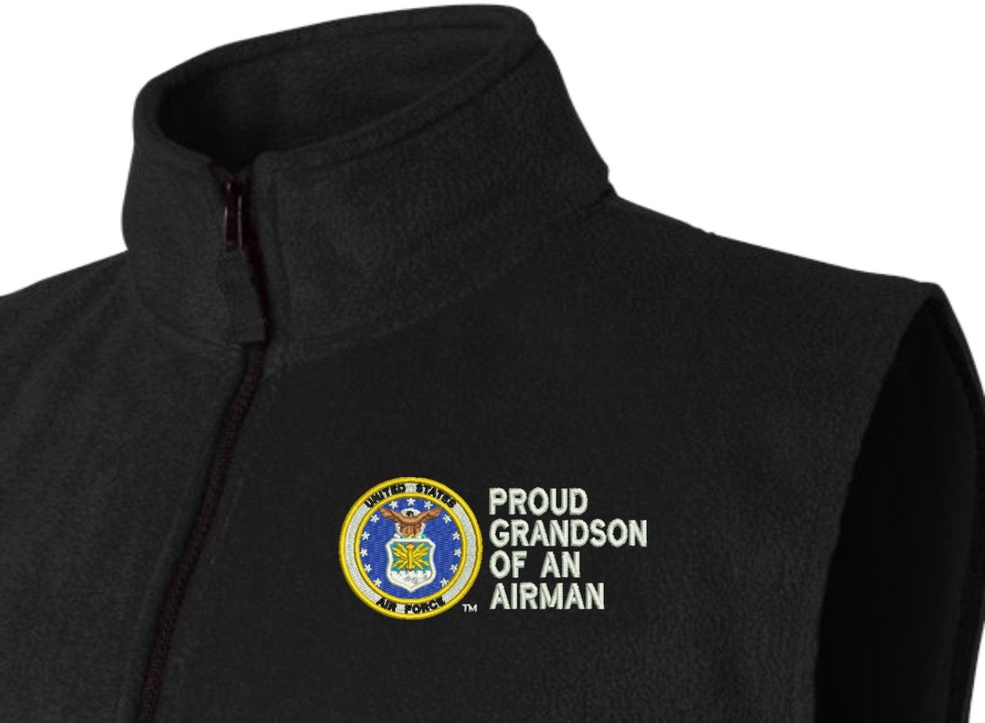 Due to supply chain disruptions, some colors and sizes may not be available in the same Brand, in these cases a brand of comparable quality will be used. Feel free to call in advance of your order, with questions you may have.MilitaryBest is proud to offer this quality Proud Grandson of an Airman U.S. Air Force Full Zip Fleece Vest. This Proud Grandson of an Airman U.S. Air Force Full Zip Fleece Vest features a convertible collar with dyed-to-match zipper pull, oversized nylon reinforced slash pockets, and an elastic hem. It is made using a 100% anti-pill polyester Fleece Vest. This Proud Grandson of an Airman U.S. Air Force Full Zip Fleece Vest will make an excellent addition to your wardrobe, or a quality gift. Your satisfaction is guaranteed! These Vests are custom embroidered at our facilities in Scottsboro, AL.