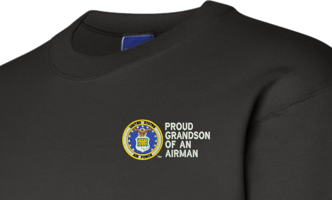 MilitaryBest has expanded its line of apparel with this custom embroidered Proud Grandson of an Airman U.S. Air Force Sweatshirt. Each sweatshirt is direct embroidered onto either a Champion or Jerzees brand sweatshirt using a 9.5 oz 50/50 Cotton Poly blend material. This Proud Grandson of an Airman U.S. Air Force Sweatshirt will make an excellent addition to your wardrobe, or a great gift. Your satisfaction is Guaranteed! This Proud Grandson of an Airman U.S. Air Force Sweatshirt is custom embroidered at our facilities in Scottsboro, AL.
