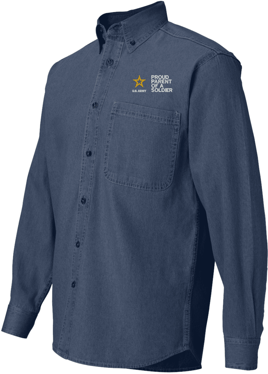 Note: Some of the Color Options pictured may not be available. Available Color Options are listed on the drop down menu above.MilitaryBest has expanded its line of apparel with this custom embroidered Proud Parent of a Soldier U.S. Army Denim Shirt. This Sierra Pacific long sleeve button down denim shirt is made using a 100% cotton denim material. This Proud Parent of a Soldier U.S. Army Denim Shirt will make an excellent addition to your wardrobe or a quality gift. This Proud Parent of a Soldier U.S. Army Denim Shirt is custom embroidered at our facilities in Scottsboro, Alabama.