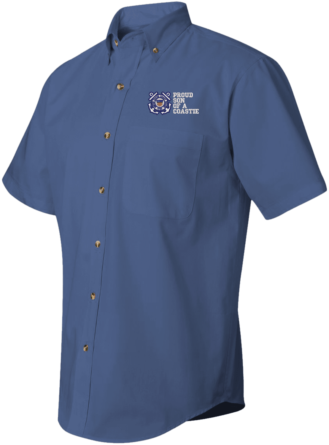 We are selling out of our remaining inventory of this discontinued item at a limited supply.MilitaryBest has expanded its line of apparel with this custom embroidered Proud Son of a Coastie U.S. Coast Guard Short Sleeve Dress Shirt. This Featherlite brand short sleeve button down dress shirt is made using a stain-resistant 60/40 cotton/polyester twill material. This Proud Son of a Coastie U.S. Coast Guard Short Sleeve Dress Shirt will make an excellent addition to your wardrobe or a quality gift. This Proud Son of a Coastie U.S. Coast Guard Short Sleeve Dress Shirt is custom embroidered at our facilities in Scottsboro, Alabama.