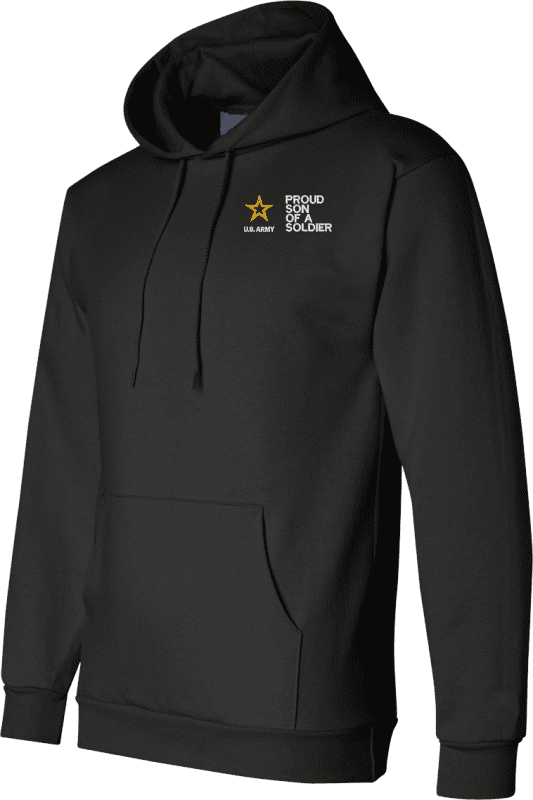 MilitaryBest has expanded its line of apparel with this custom embroidered Proud Son of a Soldier U.S. Army Hoodie. Each Hoodie is direct embroidered onto a Champion brand 9.5 oz 50/50 Cotton Poly blend. This Proud Son of a Soldier U.S. Army Hoodie will make an excellent addition to your wardrobe, or a great gift. Your satisfaction is Guaranteed! This Proud Son of a Soldier U.S. Army Hoodie is custom embroidered at our facilities in Scottsboro, AL.