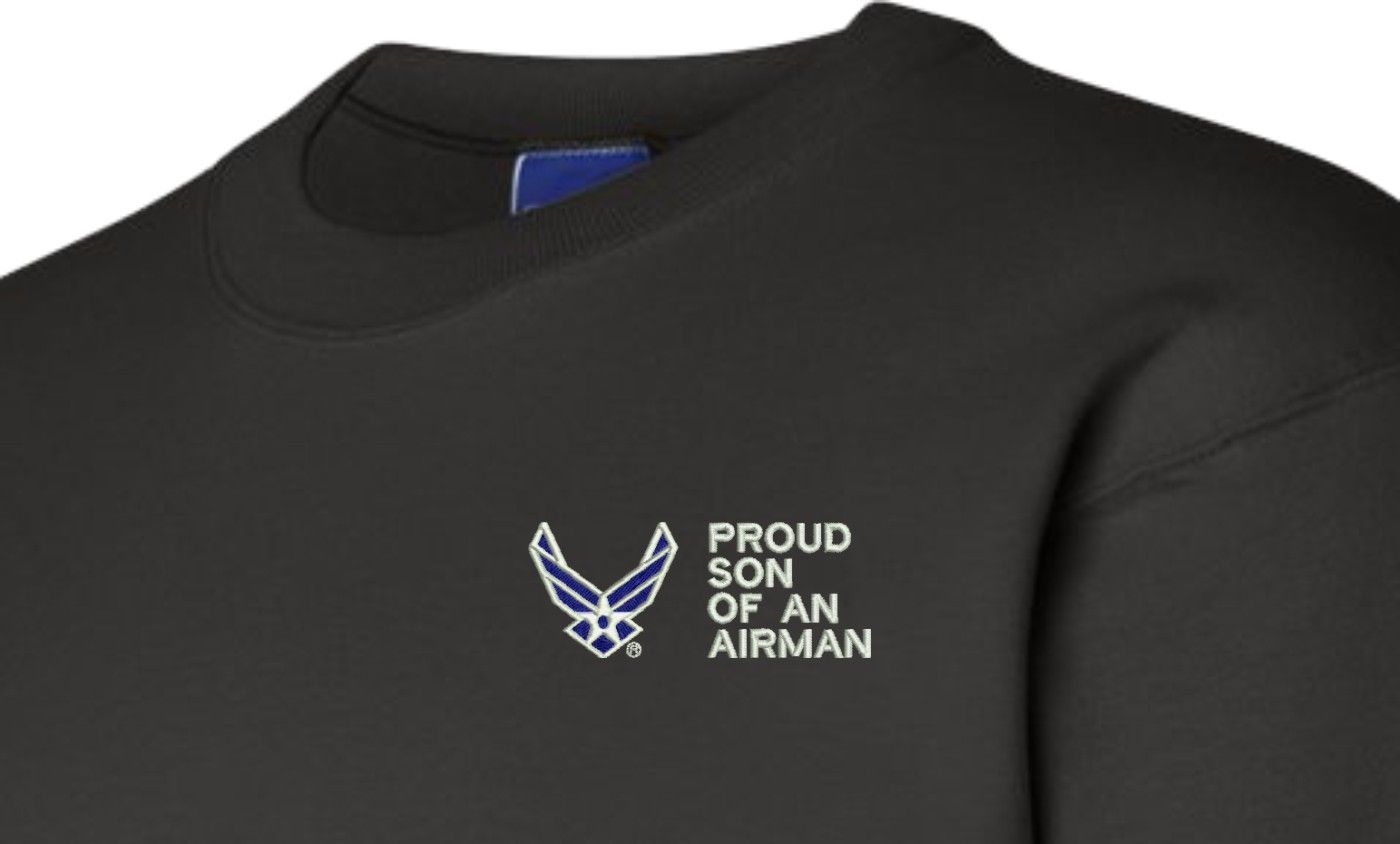 MilitaryBest has expanded its line of apparel with this custom embroidered Proud Son of an Airman U.S. Air Force Sweatshirt. Each sweatshirt is direct embroidered onto either a Champion or Jerzees brand sweatshirt using a 9.5 oz 50/50 Cotton Poly blend material. This Proud Son of an Airman U.S. Air Force Sweatshirt will make an excellent addition to your wardrobe, or a great gift. Your satisfaction is Guaranteed! This Proud Son of an Airman U.S. Air Force Sweatshirt is custom embroidered at our facilities in Scottsboro, AL.