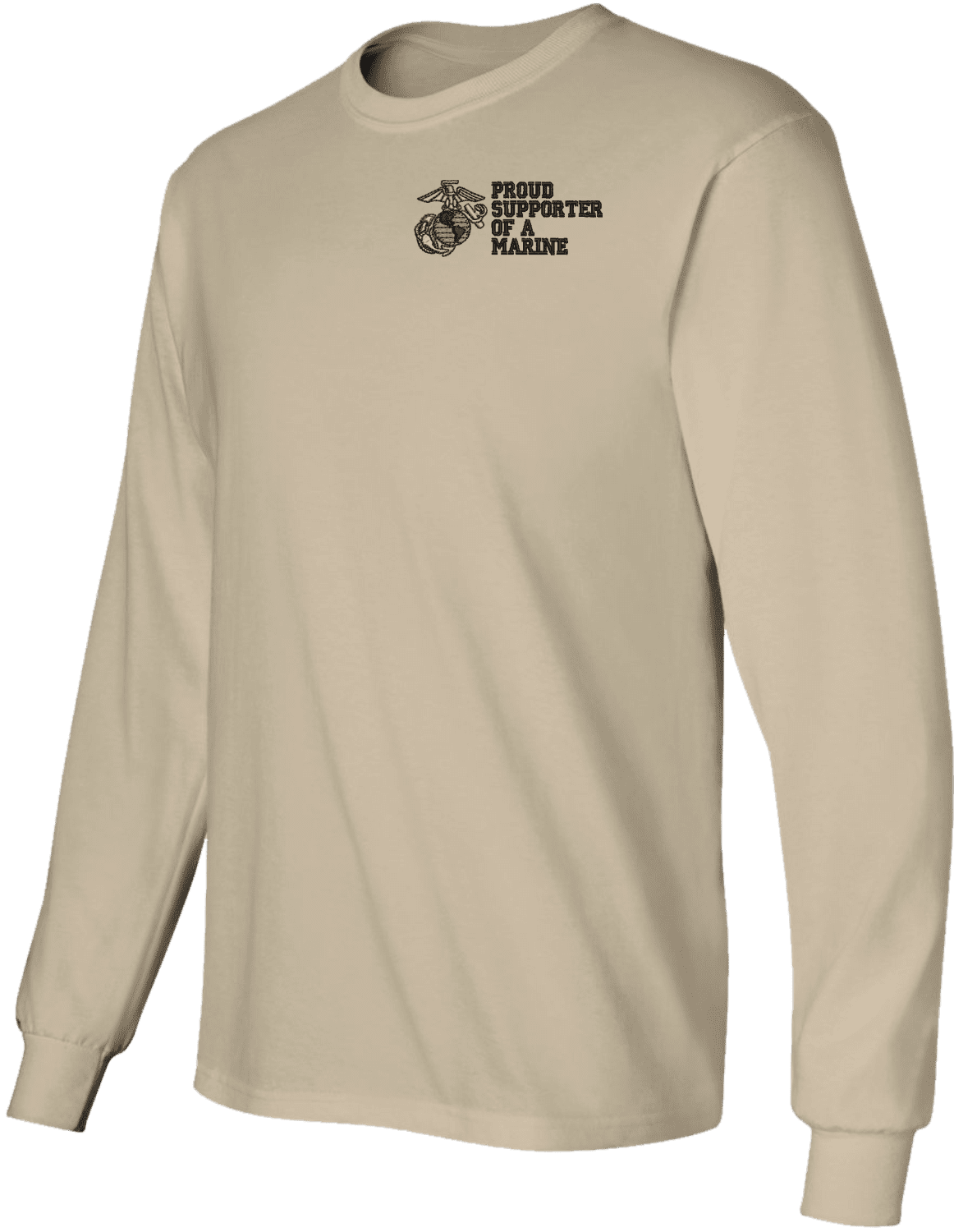 Note: Some of the Color Options pictured may not be available. Available Color Options are listed on the drop down menu above.MilitaryBest has expanded its line of apparel with this custom embroidered Proud Supporter of a Marine U.S. Marine Corps Embroidered Long Sleeve T-Shirt. This Gildan brand long sleeve t-shirt is made using a 6 oz pre-shrunk 100% cotton material. This Proud Supporter of a Marine U.S. Marine Corps Embroidered Long Sleeve T-Shirt will make an excellent addition to your wardrobe or a quality gift. This Proud Supporter of a Marine U.S. Marine Corps Embroidered Long Sleeve T-Shirt is custom embroidered at our facilities in Scottsboro, Alabama.