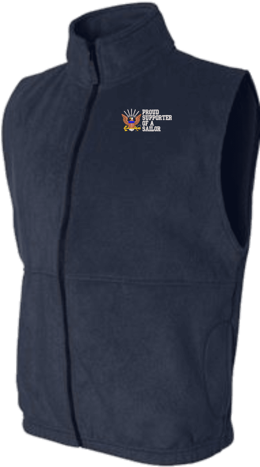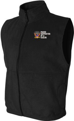 Due to supply chain disruptions, some colors and sizes may not be available in the same Brand, in these cases a brand of comparable quality will be used. Feel free to call in advance of your order, with questions you may have.MilitaryBest is proud to offer this quality Proud Supporter of a Sailor U.S. Navy Full Zip Fleece Vest. This Proud Supporter of a Sailor U.S. Navy Full Zip Fleece Vest features a convertible collar with dyed-to-match zipper pull, oversized nylon reinforced slash pockets, and an elastic hem. It is made using a 100% anti-pill polyester Fleece Vest. This Proud Supporter of a Sailor U.S. Navy Full Zip Fleece Vest will make an excellent addition to your wardrobe, or a quality gift. Your satisfaction is guaranteed! These Vests are custom embroidered at our facilities in Scottsboro, AL.