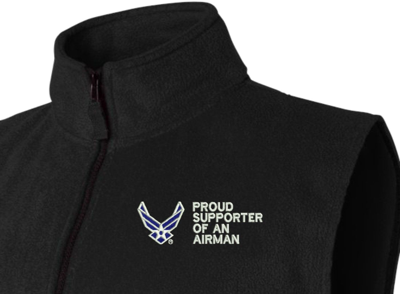 Due to supply chain disruptions, some colors and sizes may not be available in the same Brand, in these cases a brand of comparable quality will be used. Feel free to call in advance of your order, with questions you may have.MilitaryBest is proud to offer this quality Proud Supporter of an Airman U.S. Air Force Full Zip Fleece Vest. This Proud Supporter of an Airman U.S. Air Force Full Zip Fleece Vest features a convertible collar with dyed-to-match zipper pull, oversized nylon reinforced slash pockets, and an elastic hem. It is made using a 100% anti-pill polyester Fleece Vest. This Proud Supporter of an Airman U.S. Air Force Full Zip Fleece Vest will make an excellent addition to your wardrobe, or a quality gift. Your satisfaction is guaranteed! These Vests are custom embroidered at our facilities in Scottsboro, AL.