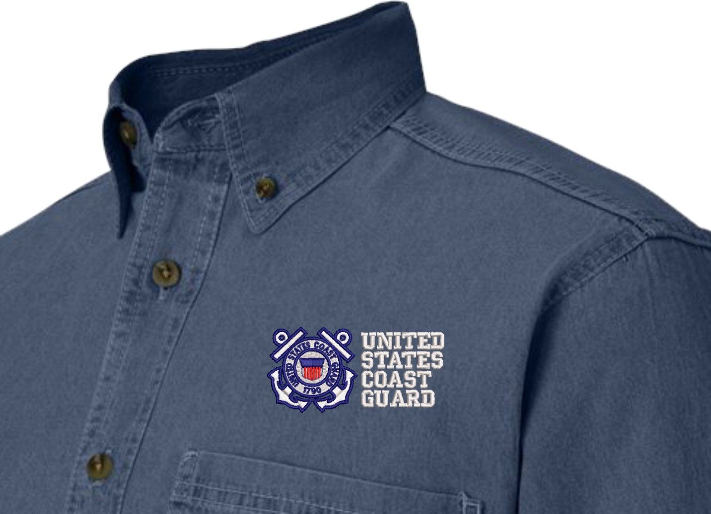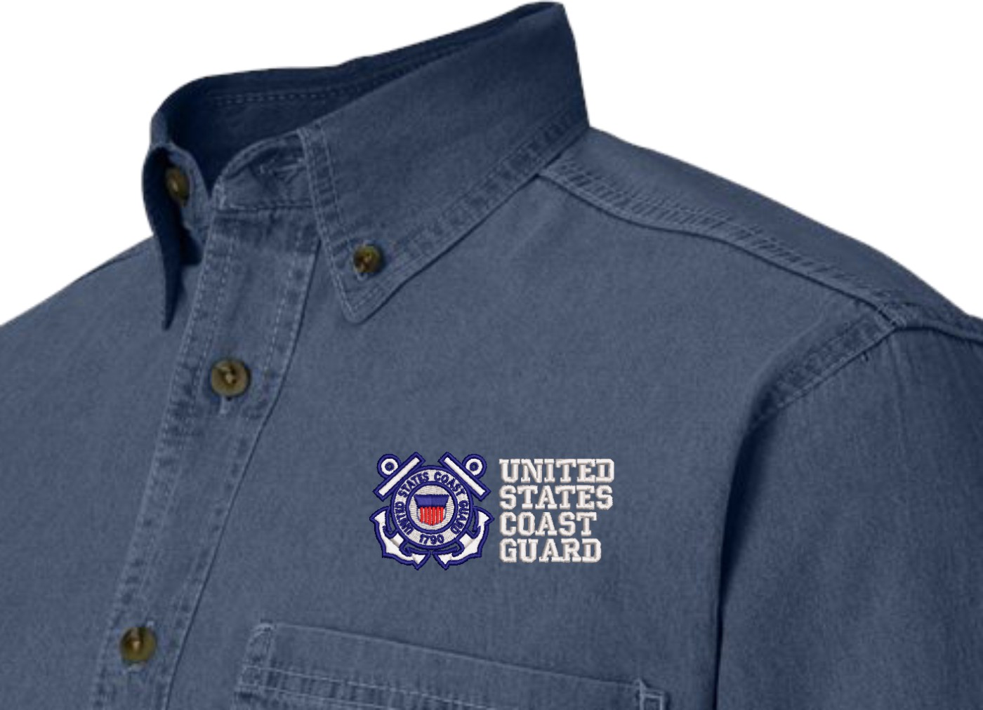 Note: Some of the Color Options pictured may not be available. Available Color Options are listed on the drop down menu above.MilitaryBest has expanded its line of apparel with this custom embroidered United States Coast Guard Denim Shirt. This long sleeve button down denim shirt is made using a 100% cotton denim material. This United States Coast Guard Denim Shirt will make an excellent addition to your wardrobe or a quality gift. This United States Coast Guard Denim Shirt is custom embroidered at our facilities in Scottsboro, Alabama.