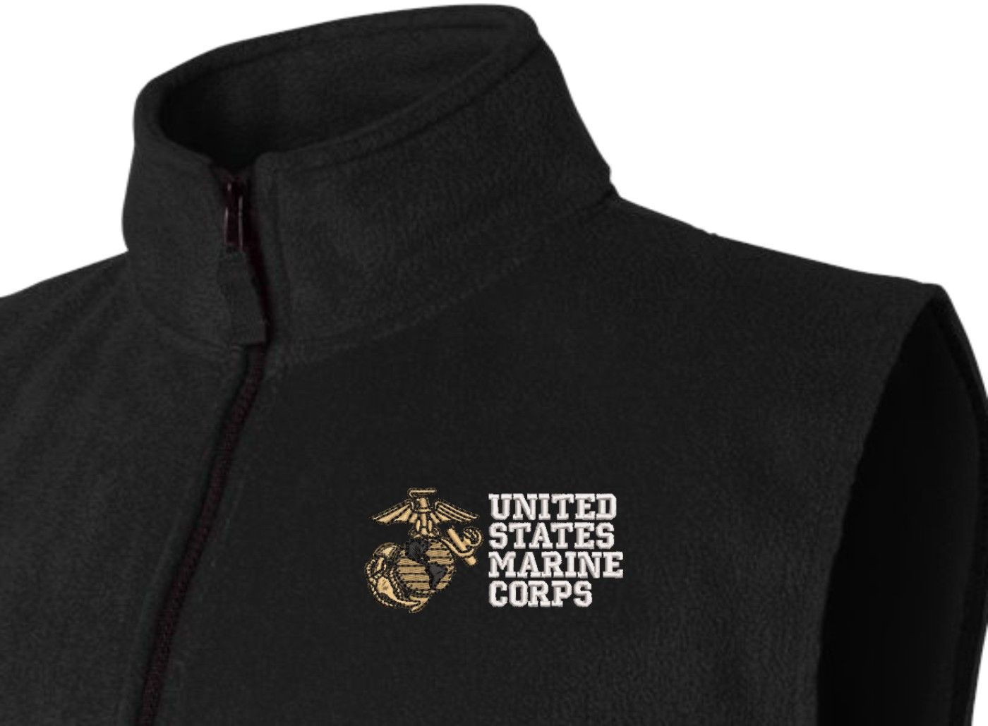 Due to supply chain disruptions, some colors and sizes may not be available in the same Brand, in these cases a brand of comparable quality will be used. Feel free to call in advance of your order, with questions you may have.MilitaryBest is proud to offer this quality United States Marine Corps Full Zip Fleece Vest. This United States Marine Corps Full Zip Fleece Vest features a convertible collar with dyed-to-match zipper pull, oversized nylon reinforced slash pockets, and an elastic hem. It is made using a 100% anti-pill polyester Fleece Vest. This United States Marine Corps Full Zip Fleece Vest will make an excellent addition to your wardrobe, or a quality gift. Your satisfaction is guaranteed! These Vests are custom embroidered at our facilities in Scottsboro, AL.