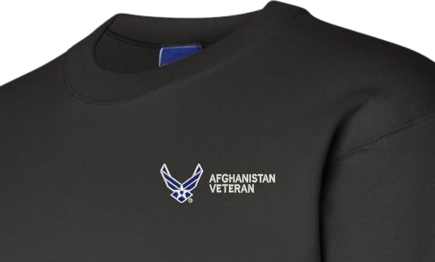 MilitaryBest has expanded its line of apparel with this custom embroidered U.S. Air Force Afghanistan Veteran Sweatshirt. Each sweatshirt is direct embroidered onto either a Champion or Jerzees brand sweatshirt using a 9.5 oz 50/50 Cotton Poly blend material. This U.S. Air Force Afghanistan Veteran Sweatshirt will make an excellent addition to your wardrobe, or a great gift. Your satisfaction is Guaranteed! This U.S. Air Force Afghanistan Veteran Sweatshirt is custom embroidered at our facilities in Scottsboro, AL.