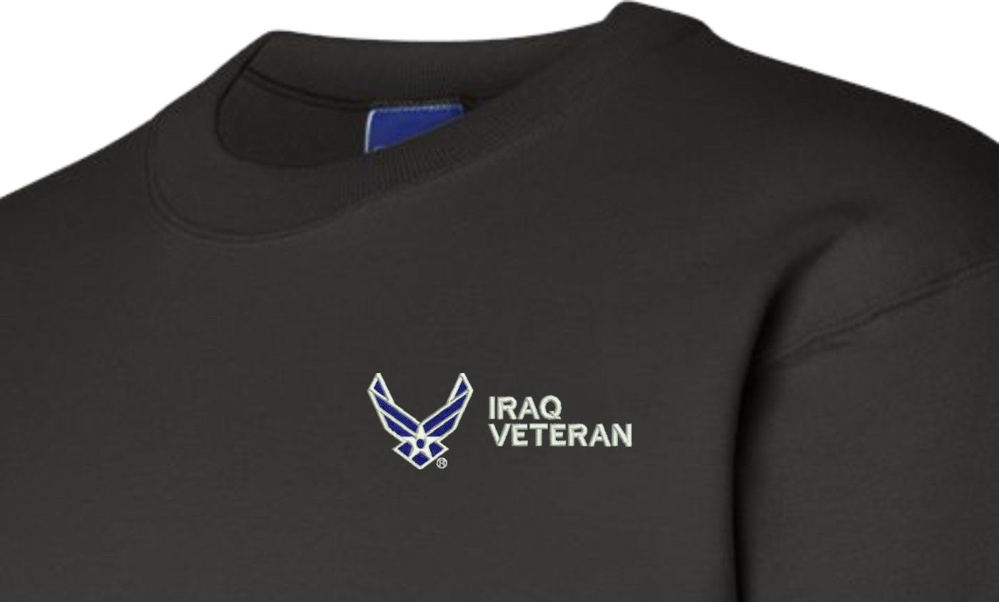MilitaryBest has expanded its line of apparel with this custom embroidered U.S. Air Force Iraq Veteran Sweatshirt. Each sweatshirt is direct embroidered onto either a Champion or Jerzees brand sweatshirt using a 9.5 oz 50/50 Cotton Poly blend material. This U.S. Air Force Iraq Veteran Sweatshirt will make an excellent addition to your wardrobe, or a great gift. Your satisfaction is Guaranteed! This U.S. Air Force Iraq Veteran Sweatshirt is custom embroidered at our facilities in Scottsboro, AL.