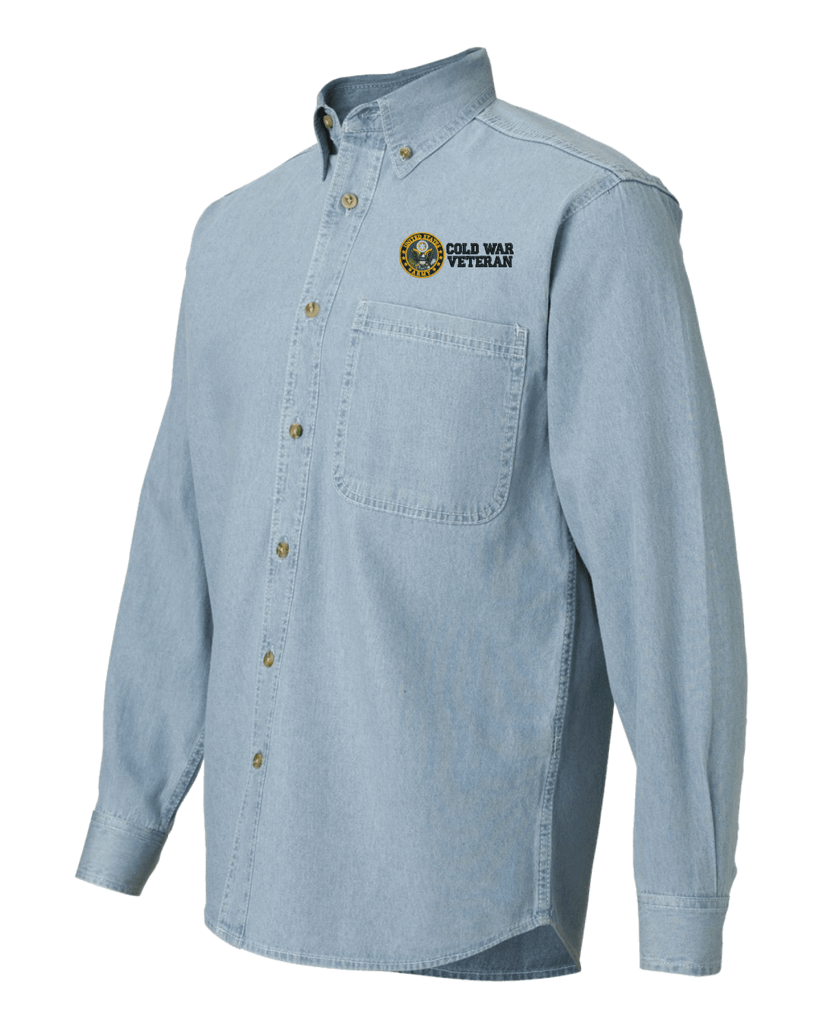 Note: Some of the Color Options pictured may not be available. Available Color Options are listed on the drop down menu above.MilitaryBest has expanded its line of apparel with this custom embroidered U.S. Army Cold War Veteran Denim Shirt. This long sleeve button down denim shirt is made using a 100% cotton denim material. This U.S. Army Cold War Veteran Denim Shirt will make an excellent addition to your wardrobe or a quality gift. This U.S. Army Cold War Veteran Denim Shirt is custom embroidered at our facilities in Scottsboro, Alabama.
