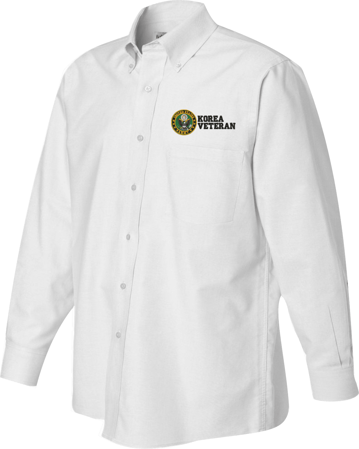 Note: Some of the Color Options pictured may not be available. Available Color Options are listed on the drop down menu above.MilitaryBest has expanded its line of apparel with this custom embroidered U.S. Army Korea Veteran Oxford Shirt. This Van Heusen brand Oxford long sleeve button down dress shirt is made using a wrinkle-free, pill and stain resistant 60/40 cotton/polyester material. This U.S. Army Korea Veteran Oxford Shirt will make an excellent addition to your wardrobe or a quality gift. This U.S. Army Korea Veteran Oxford Shirt is custom embroidered at our facilities in Scottsboro, Alabama.