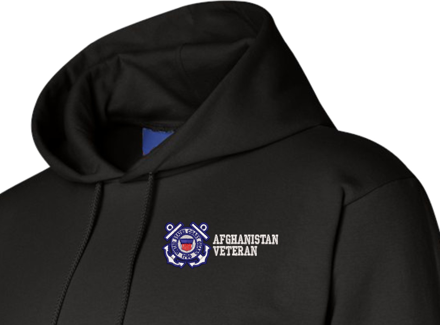 MilitaryBest has expanded its line of apparel with this custom embroidered U.S. Coast Guard Afghanistan Veteran Hoodie. Each Hoodie is direct embroidered onto a Champion brand 9.5 oz 50/50 Cotton Poly blend. This U.S. Coast Guard Afghanistan Veteran Hoodie will make an excellent addition to your wardrobe, or a great gift. Your satisfaction is Guaranteed! This U.S. Coast Guard Afghanistan Veteran Hoodie is custom embroidered at our facilities in Scottsboro, AL.