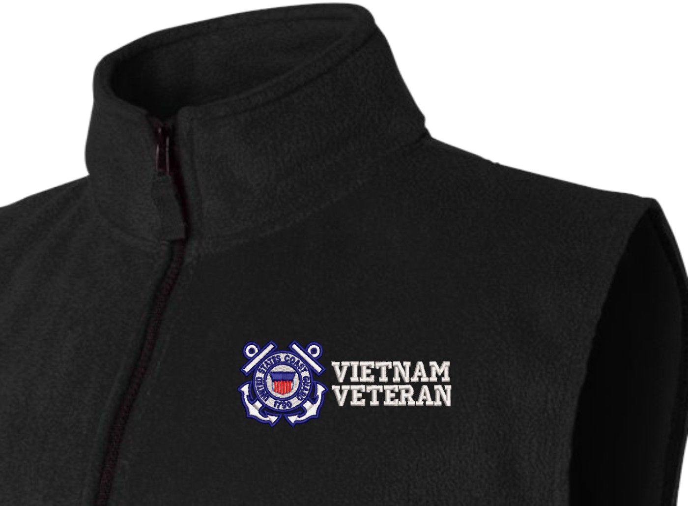 Due to supply chain disruptions, some colors and sizes may not be available in the same Brand, in these cases a brand of comparable quality will be used. Feel free to call in advance of your order, with questions you may have.MilitaryBest is proud to offer this quality U.S. Coast Guard Vietnam Veteran Full Zip Fleece Vest. This U.S. Coast Guard Vietnam Veteran Full Zip Fleece Vest features a convertible collar with dyed-to-match zipper pull, oversized nylon reinforced slash pockets, and an elastic hem. It is made using a 100% anti-pill polyester Fleece Vest. This U.S. Coast Guard Vietnam Veteran Full Zip Fleece Vest will make an excellent addition to your wardrobe, or a quality gift. Your satisfaction is guaranteed! These Vests are custom embroidered at our facilities in Scottsboro, AL.