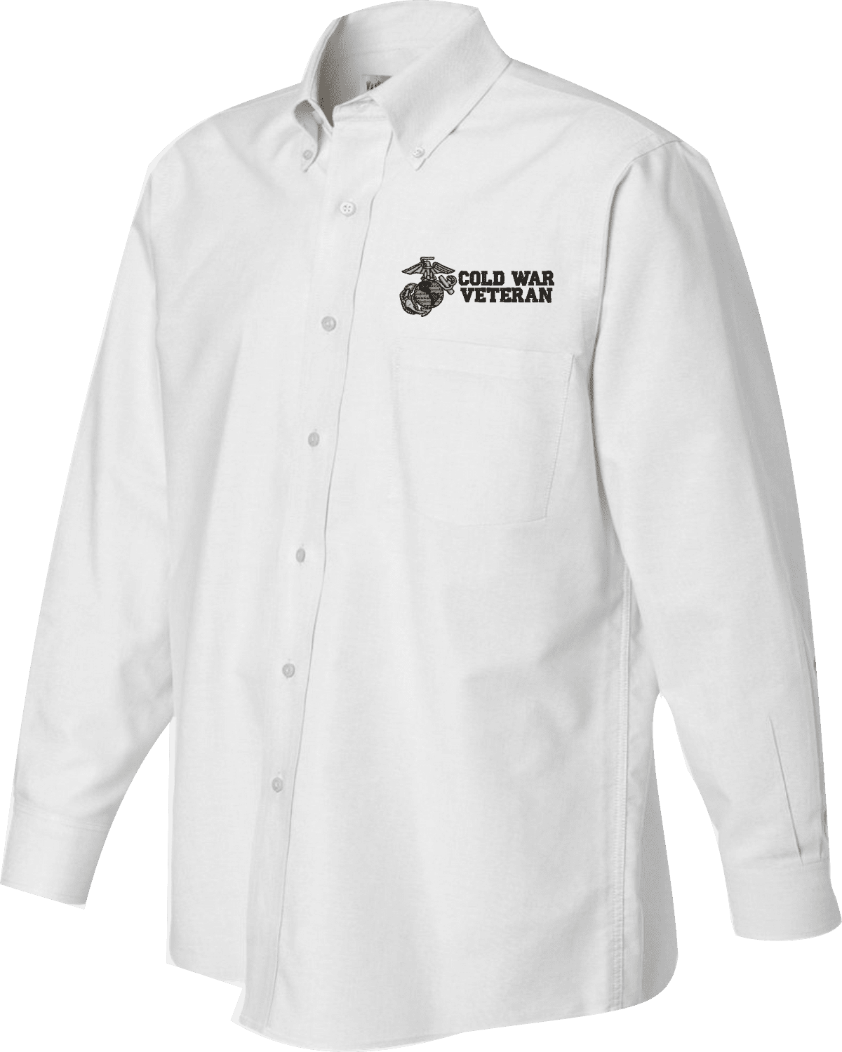 Note: Some of the Color Options pictured may not be available. Available Color Options are listed on the drop down menu above.MilitaryBest has expanded its line of apparel with this custom embroidered U.S. Marine Corps Cold War Veteran Oxford Shirt. This Van Heusen brand Oxford long sleeve button down dress shirt is made using a wrinkle-free, pill and stain resistant 60/40 cotton/polyester material. This U.S. Marine Corps Cold War Veteran Oxford Shirt will make an excellent addition to your wardrobe or a quality gift. This U.S. Marine Corps Cold War Veteran Oxford Shirt is custom embroidered at our facilities in Scottsboro, Alabama.