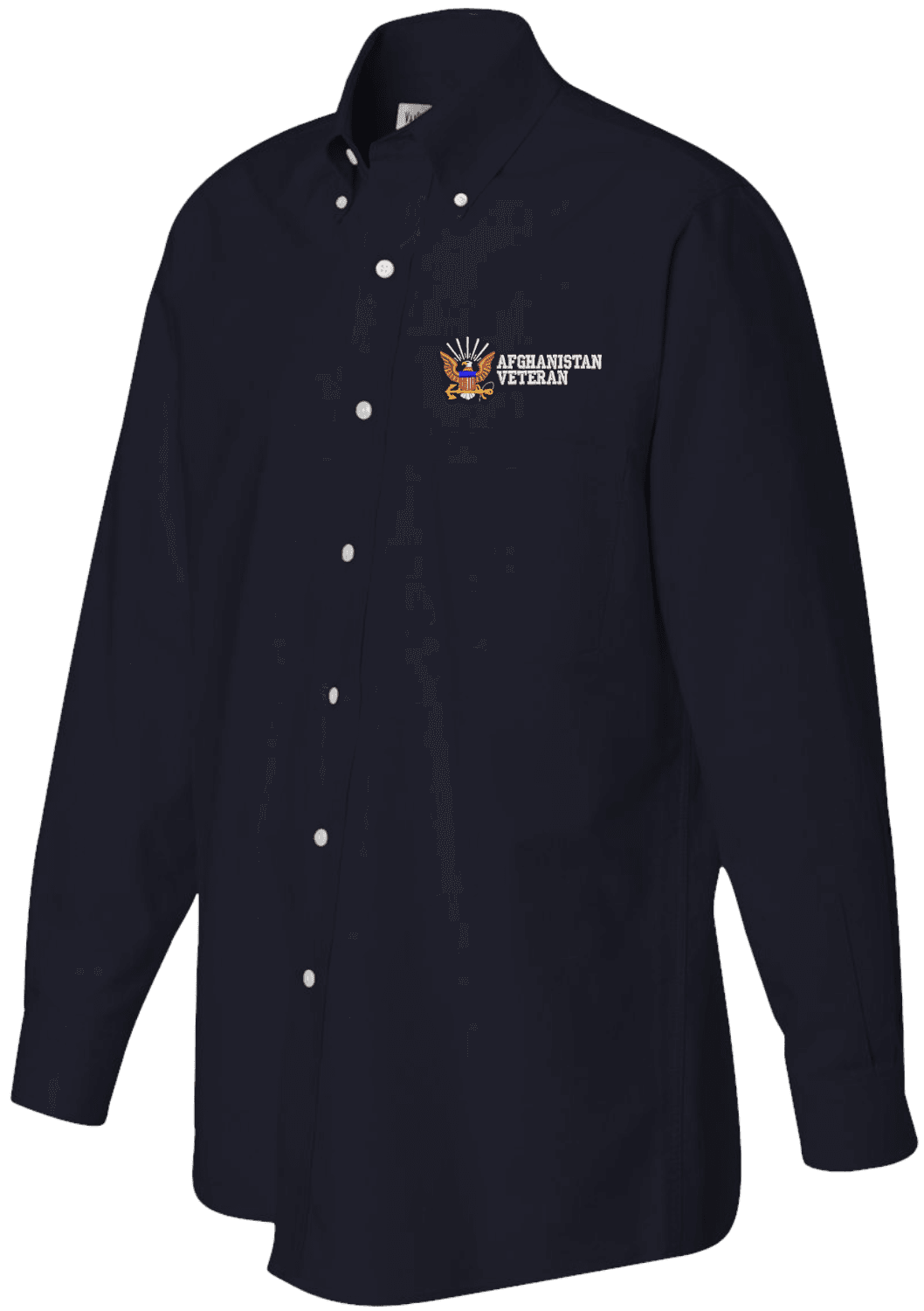 Note: Some of the Color Options pictured may not be available. Available Color Options are listed on the drop down menu above.MilitaryBest has expanded its line of apparel with this custom embroidered U.S. Navy Afghanistan Veteran Oxford Shirt. This Van Heusen brand Oxford long sleeve button down dress shirt is made using a wrinkle-free, pill and stain resistant 60/40 cotton/polyester material. This U.S. Navy Afghanistan Veteran Oxford Shirt will make an excellent addition to your wardrobe or a quality gift. This U.S. Navy Afghanistan Veteran Oxford Shirt is custom embroidered at our facilities in Scottsboro, Alabama.