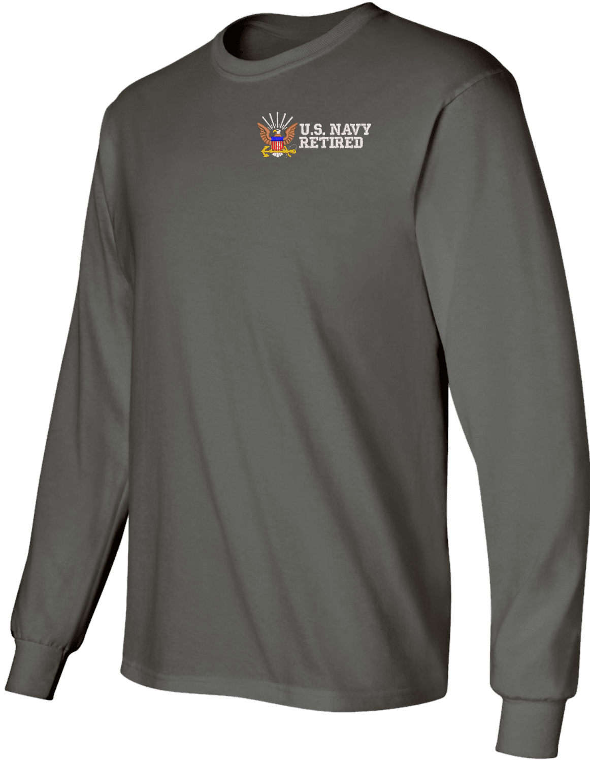 Note: Some of the Color Options pictured may not be available. Available Color Options are listed on the drop down menu above.MilitaryBest has expanded its line of apparel with this custom embroidered U.S. Navy Retired Embroidered Long Sleeve T-Shirt. This Gildan brand long sleeve t-shirt is made using a 6 oz pre-shrunk 100% cotton material. This U.S. Navy Retired Embroidered Long Sleeve T-Shirt will make an excellent addition to your wardrobe or a quality gift. This U.S. Navy Retired Embroidered Long Sleeve T-Shirt is custom embroidered at our facilities in Scottsboro, Alabama.