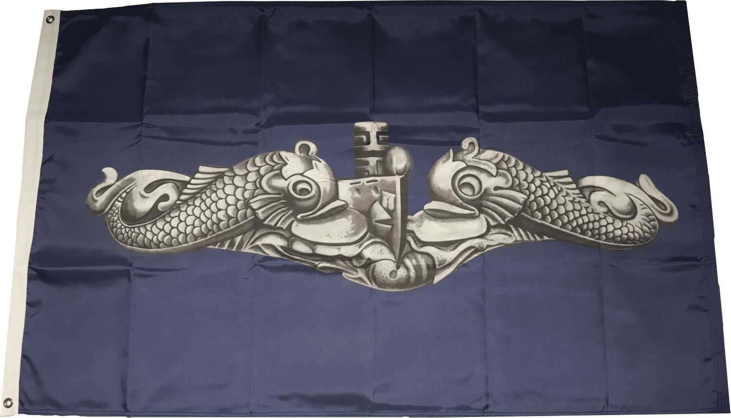 This Submariner Silver Dolphins Flag is made from 100% heavyweight marine nylon for strength and durability. This flag measures 3’ by 5’ with a 1” polypropylene white nylon web heading with solid brass grommets. It features double printed graphics on both sides of the flag. Our Submarine Force Flag is made in the USA and its quality is guaranteed.