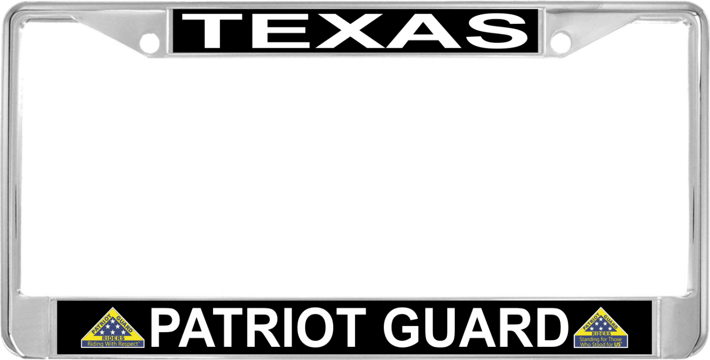 This Texas Patriot Guard Automobile License Plate Frame is proudly produced at our facility in Scottsboro, Alabama. Each Chrome Dipped Alloy Frame has Poly Coated Aluminum Inserts which allow our production team to provide you with High Quality Designs. Unfortunately, this frame is not offered as a Motorcycle Frame.Please check with your state and local regulations regarding suitability for displaying this Automobile License Plate Frame on your vehicle since these regulations may have changed in your state. Various weather and road conditions may impact the life span of your frame e.g. salted roads, long exposure to direct sunlight etc.