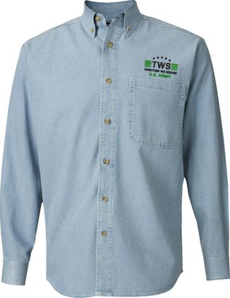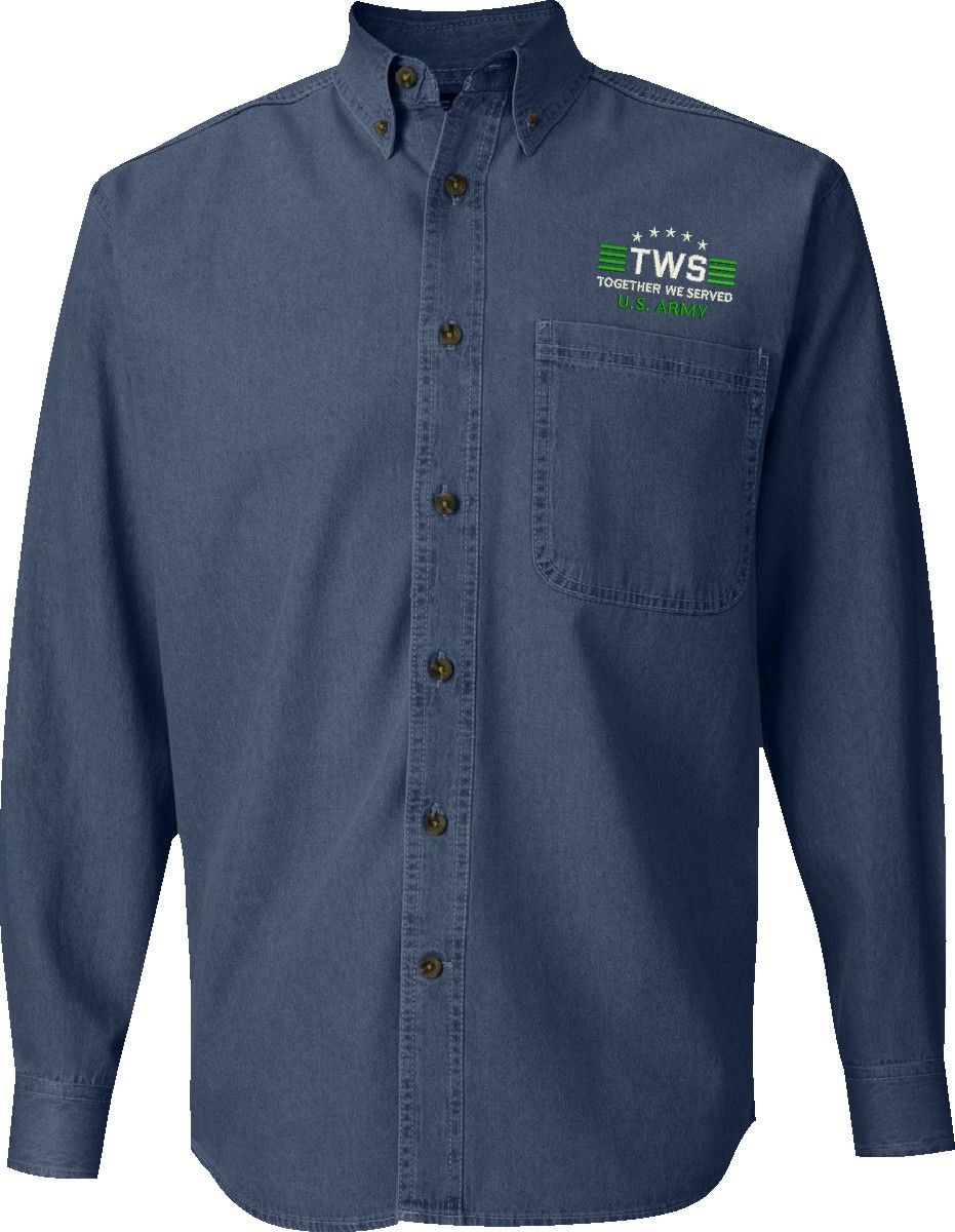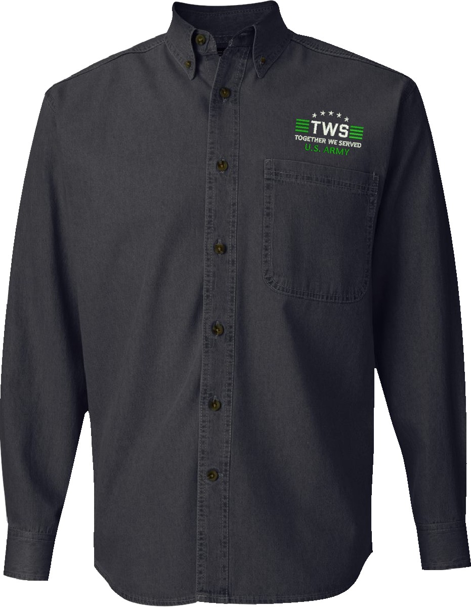 MilitaryBest is proud to offer Together We Served U.S. Army Denim Button Down shirts. Each shirt is embroidered to order at our facilities in Scottsboro, AL by Americans with a passion for patriotism.