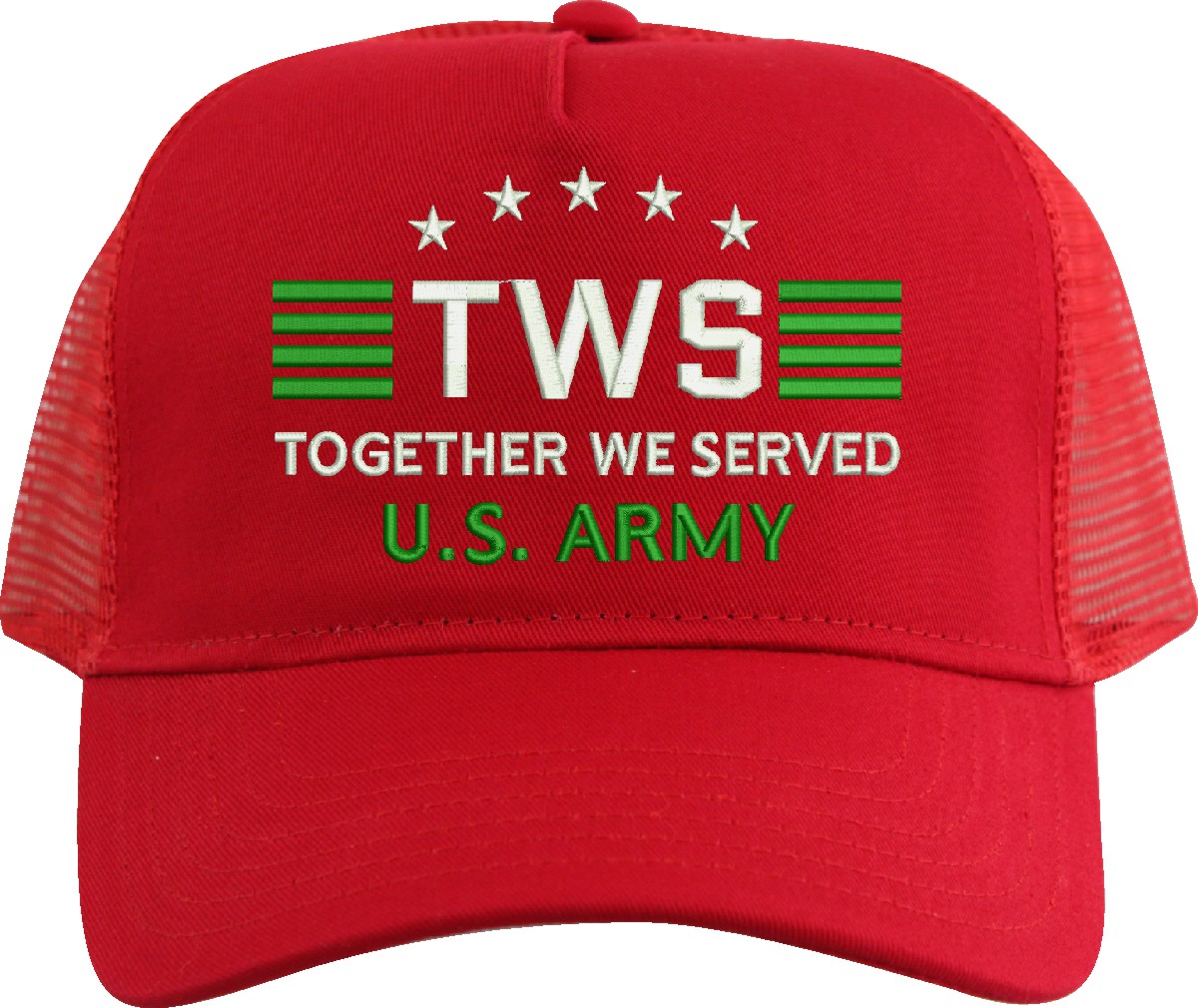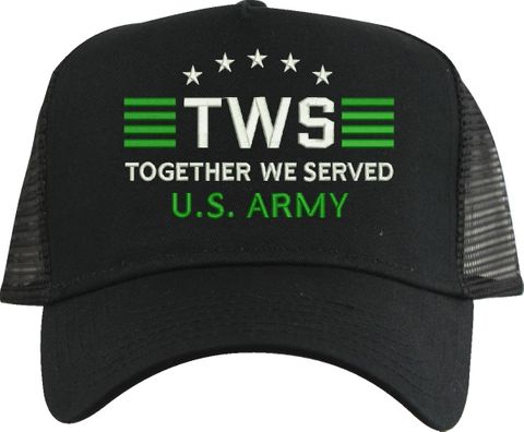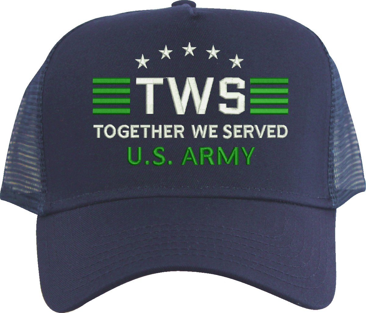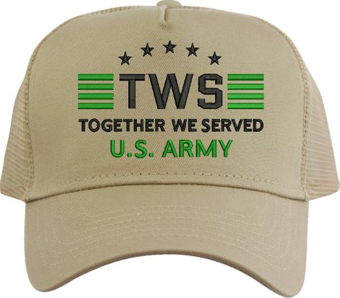 MilitaryBest is proud to offer Together We Served U.S. Army mesh back caps for our United States military veterans. Each cap is embroidered to order at our facilities in Scottsboro, AL by Americans with a passion for patriotism! The mesh back is designed to let the air flow through and keep your head cool.