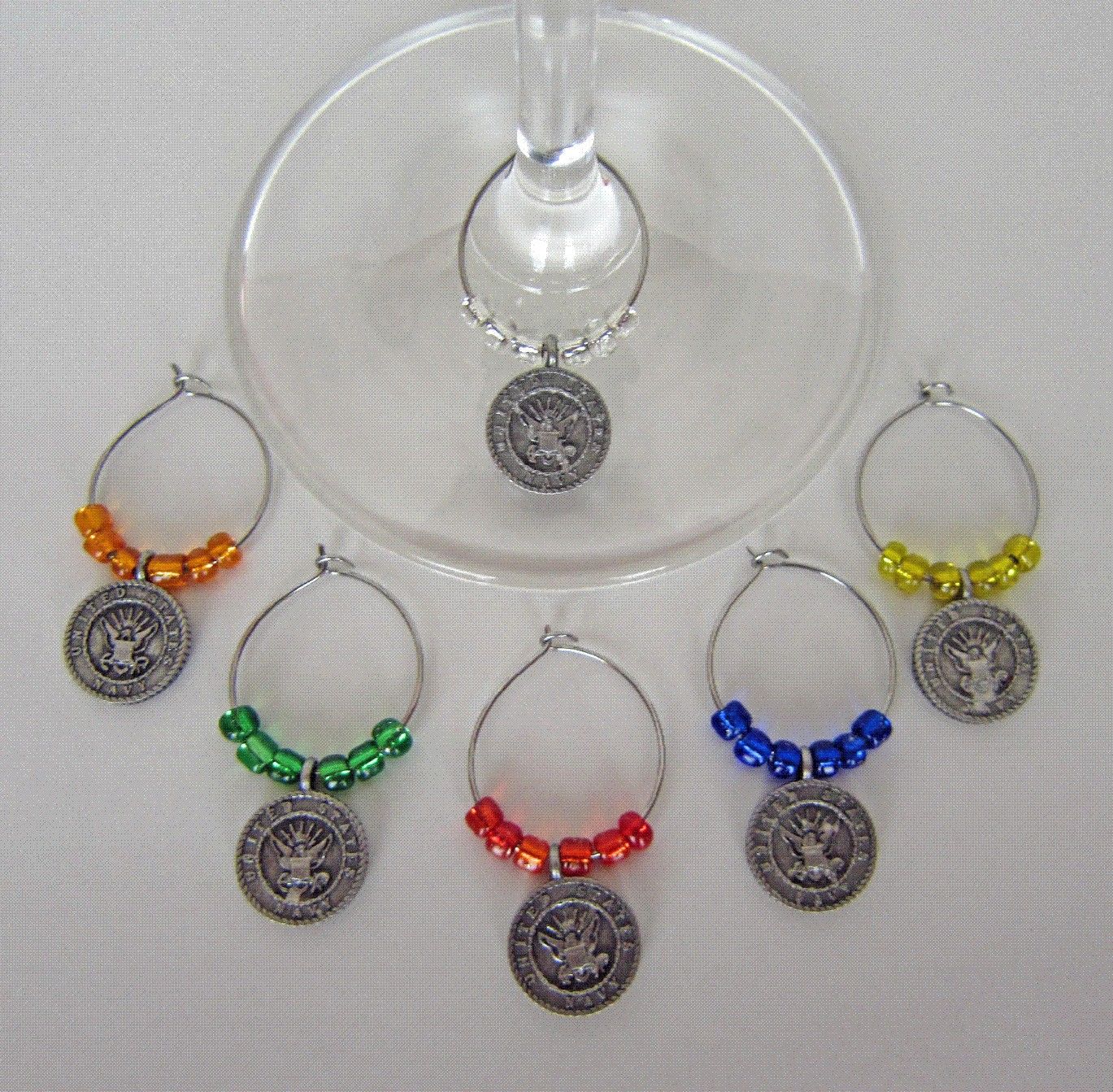 MilitaryBest is proud to introduce Military Wine Glass Charms from Towne Craft Designs.This set of 6x U.S. Navy Military Wine Glass Charms are proudly handmade in the USA of American Pewter and are adorned by glass beads in six different colors.